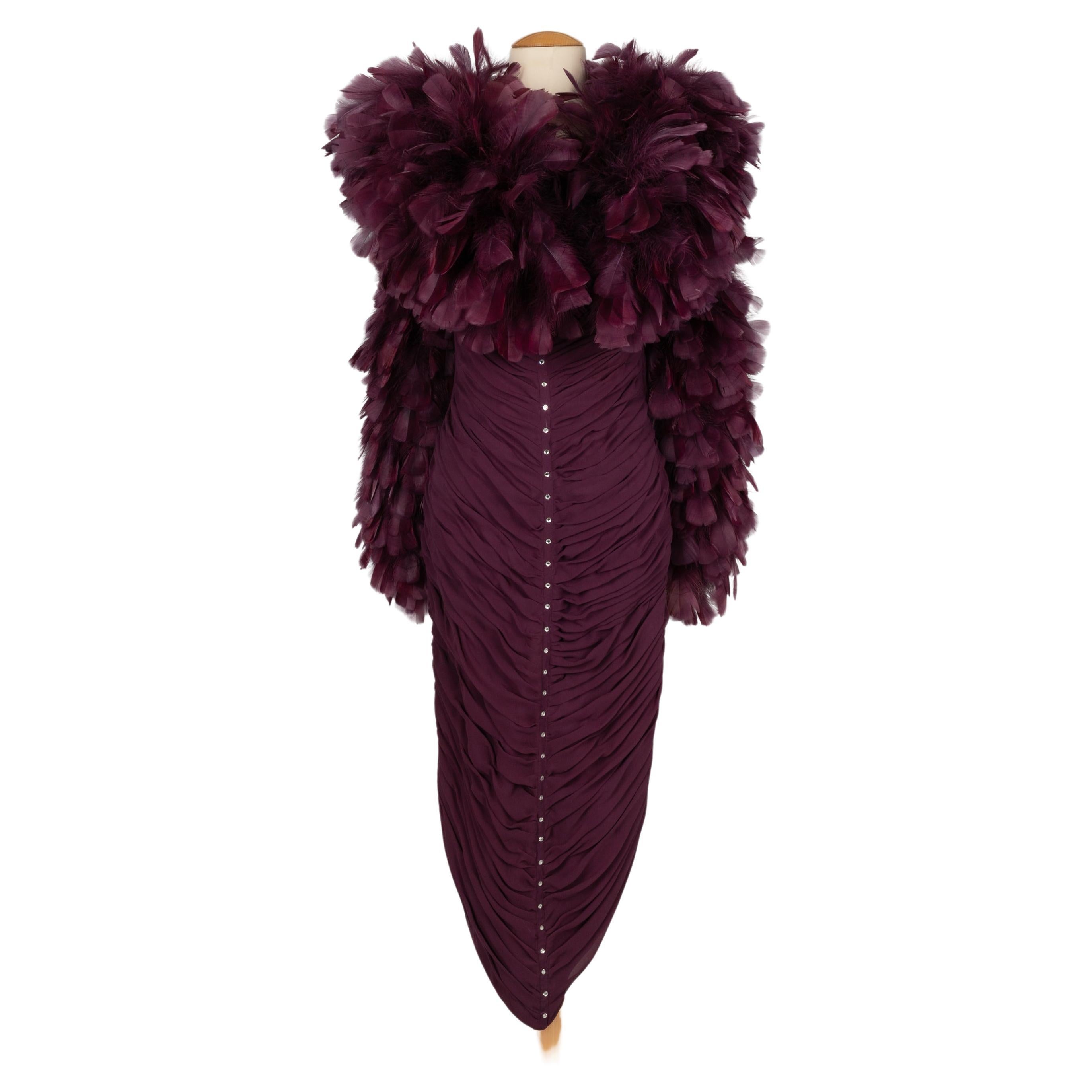 Anne Marie Beretta - Vestido de noche de crepé de georgette con plumas brillantes moradas. Colección Prêt-à-Porter Otoño-Invierno 1985-86. Sin etiqueta de talla ni composición, se aj...