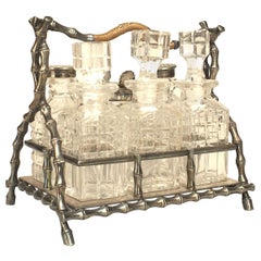 Tántalo eduardiano de caoba con un juego de tres decantadores de cristal tallado con tapones circulares, cada uno con un collarín de bebida de plata Brandy / Whisky / Oporto