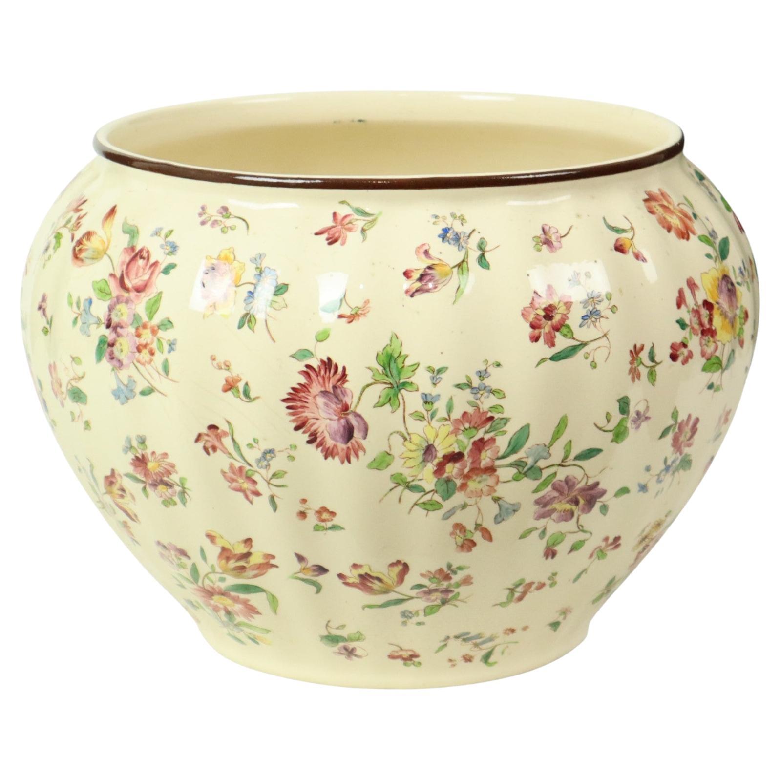 Hermosa y muy grande maceta antigua, cachepot con un diseño floral policromado de loza craquelada, marcada y numerada en la parte inferior: Longchamp Terre de Fer, estilo Art Nouveau...