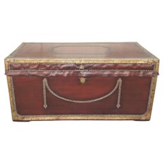 Gran baúl victoriano antiguo de cuero repujado con bandas de roble con tapa de cúpula