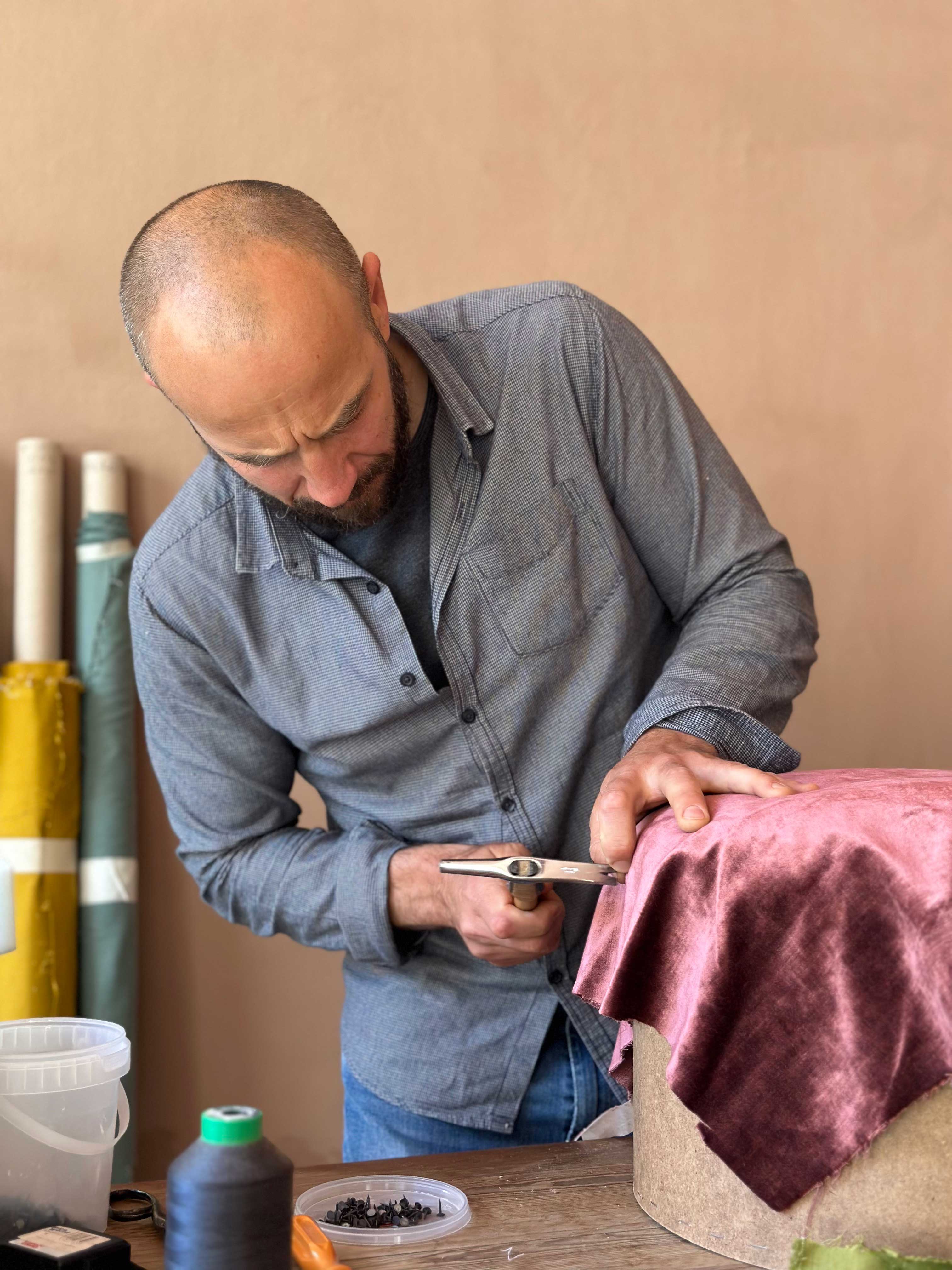 Un puf como una pequeña joya doméstica: oro, rosa y un acento de púrpura se entrelazan en una paleta de elegancia y artesanía.