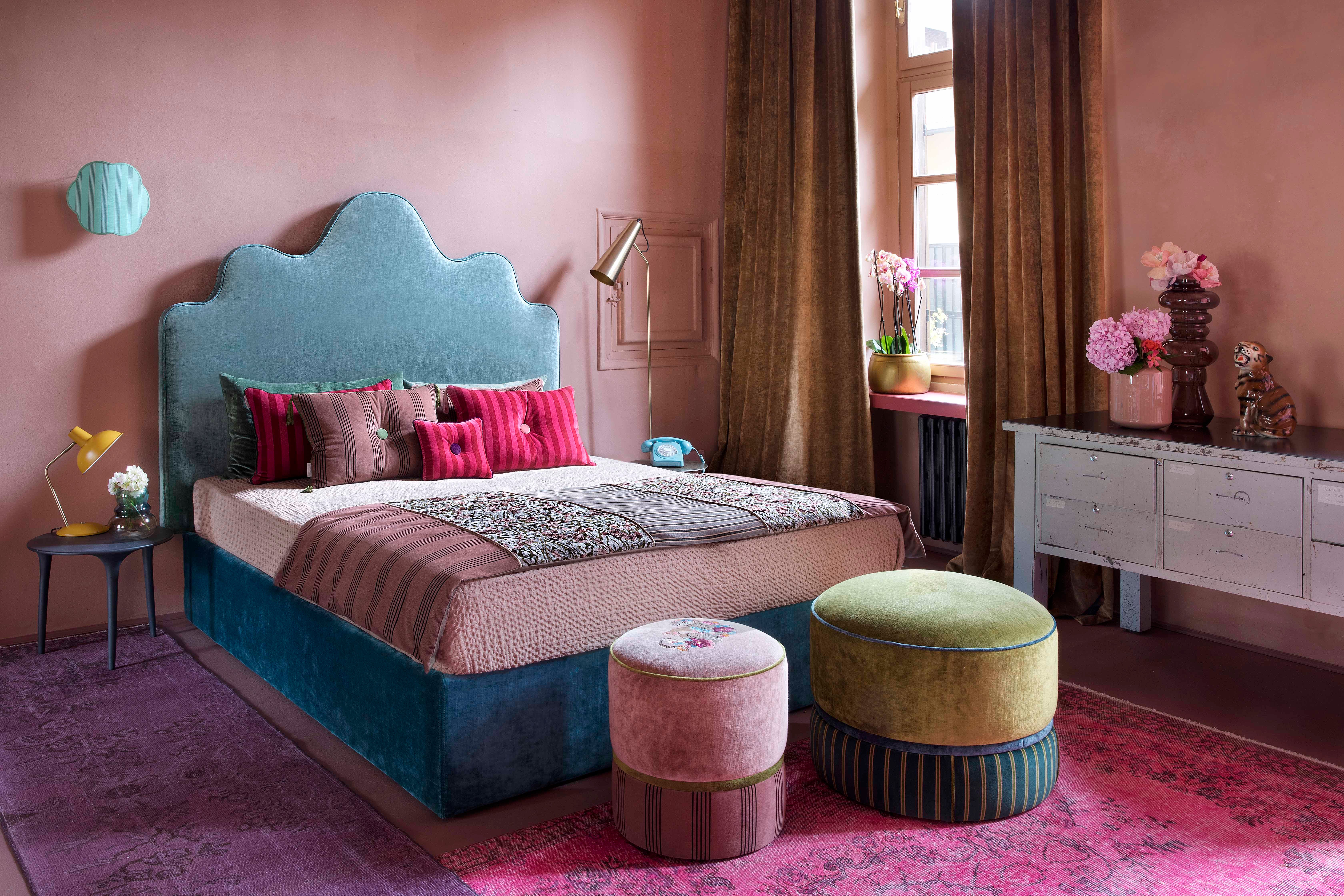 Un puf como una pequeña joya doméstica: rosa, violeta y un acento de azul claro se entrelazan en una paleta de elegancia y artesanía, adornada con meticulosos bordados a mano de peti...