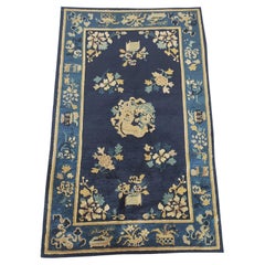 Antigua Alfombra China de Pekín Floral, Medallón Azul Marino 1900s, Fecha Circa: 1900s. Este excepcional ejemplo de tejido pekinés ejemplifica la elegancia y sobriedad característica...