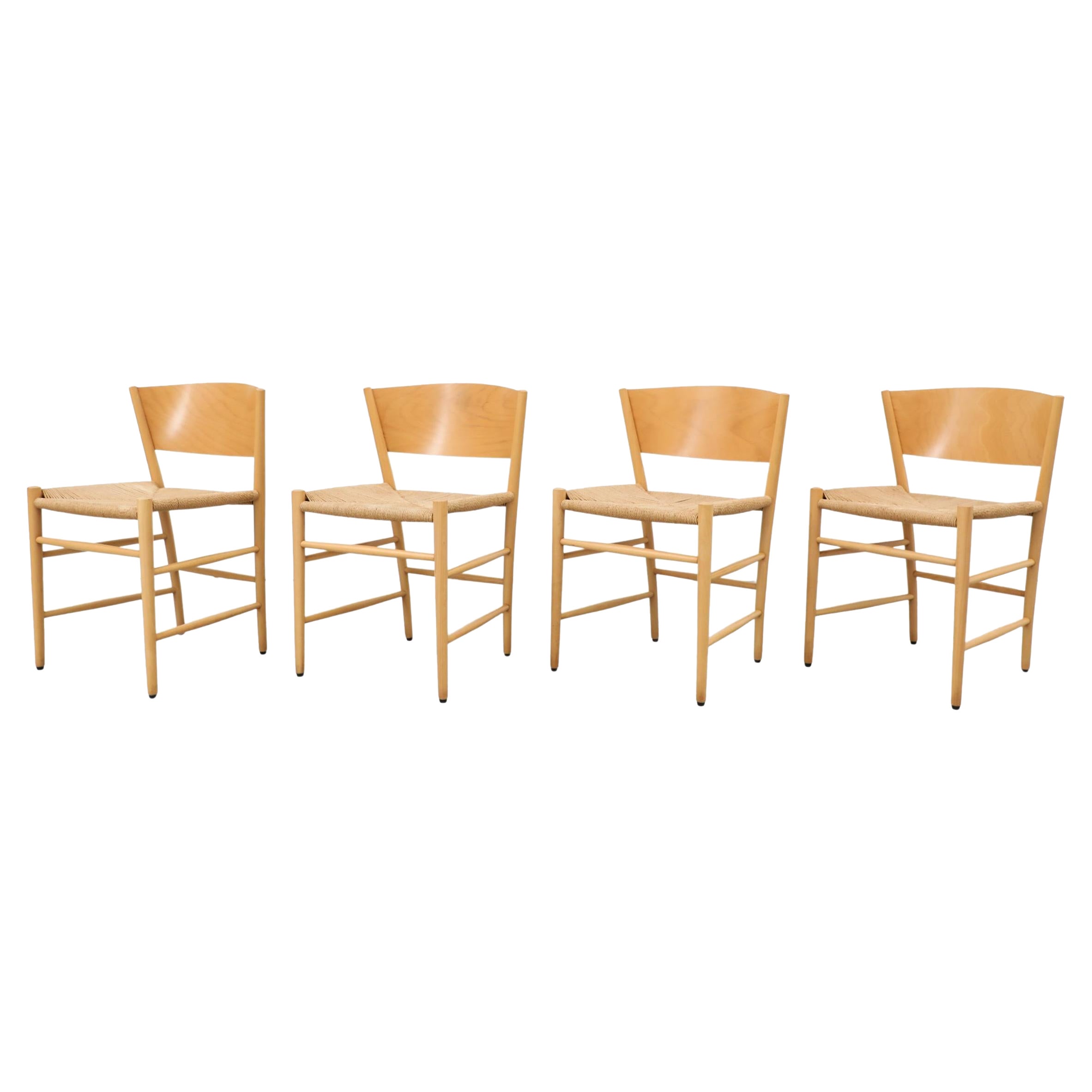 Juego de 4 sillas "Jive" de Tom Stepp para Kvist Møbler. Las sillas tienen asientos tejidos y armazón de abedul. En estado original con desgaste visible y pátina acorde con su edad y...