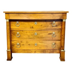 Cómoda o cajonera de madera de frutal del periodo Imperio francés de forma rectangular, los tres cajones elevados sobre patas de madera dorada, con escudos y tiradores de bronce imp...
