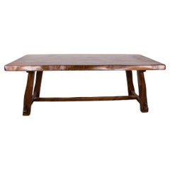 Preciosa mesa de comedor de olmo con caballete y clavijas de madera. Ligeramente repintado con un veteado impresionante. Una mezcla única de diseño rústico y moderno brutalista. Asie...