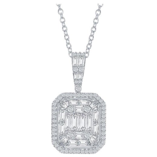 Pendientes cuadrados engastados en oro blanco de 18 quilates. Estos pendientes ilusión están engastados con un racimo de diamantes baguette y redondos en un halo. El peso total es de...