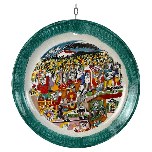 Giovanni De Simone Plato de cerámica de los años 70 con matanza de peces multicolores y pescadores