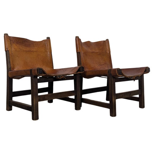 A beautiful pair of Brutalist armchairs / huntingchairs crafted in Spain during the 1960s, combining architectural form with raw, organic materials. These chairs exemplify early Brut...