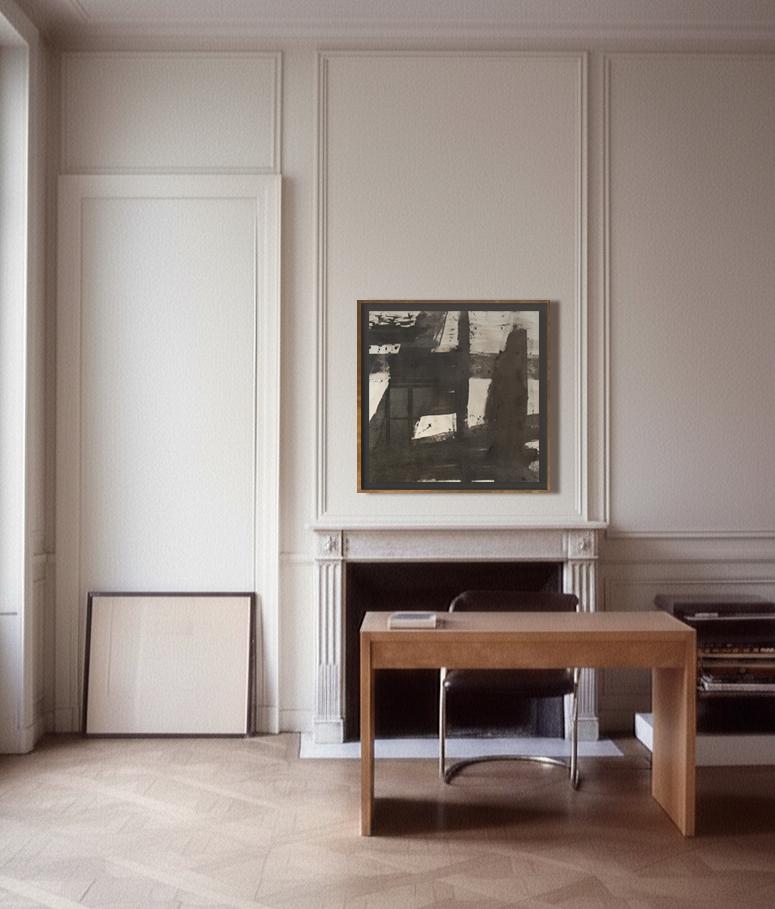 Cuadro abstracto original titulado "Marblehead" del artista sueco contemporáneo Nicolas Makelberge. Esta obra del Expresionismo Abstracto se caracteriza por una composición de varias capas ricamente texturizada, con una paleta de tonos neutros y oscuros acentuada con sutiles pigmentos metálicos o mineralizados.