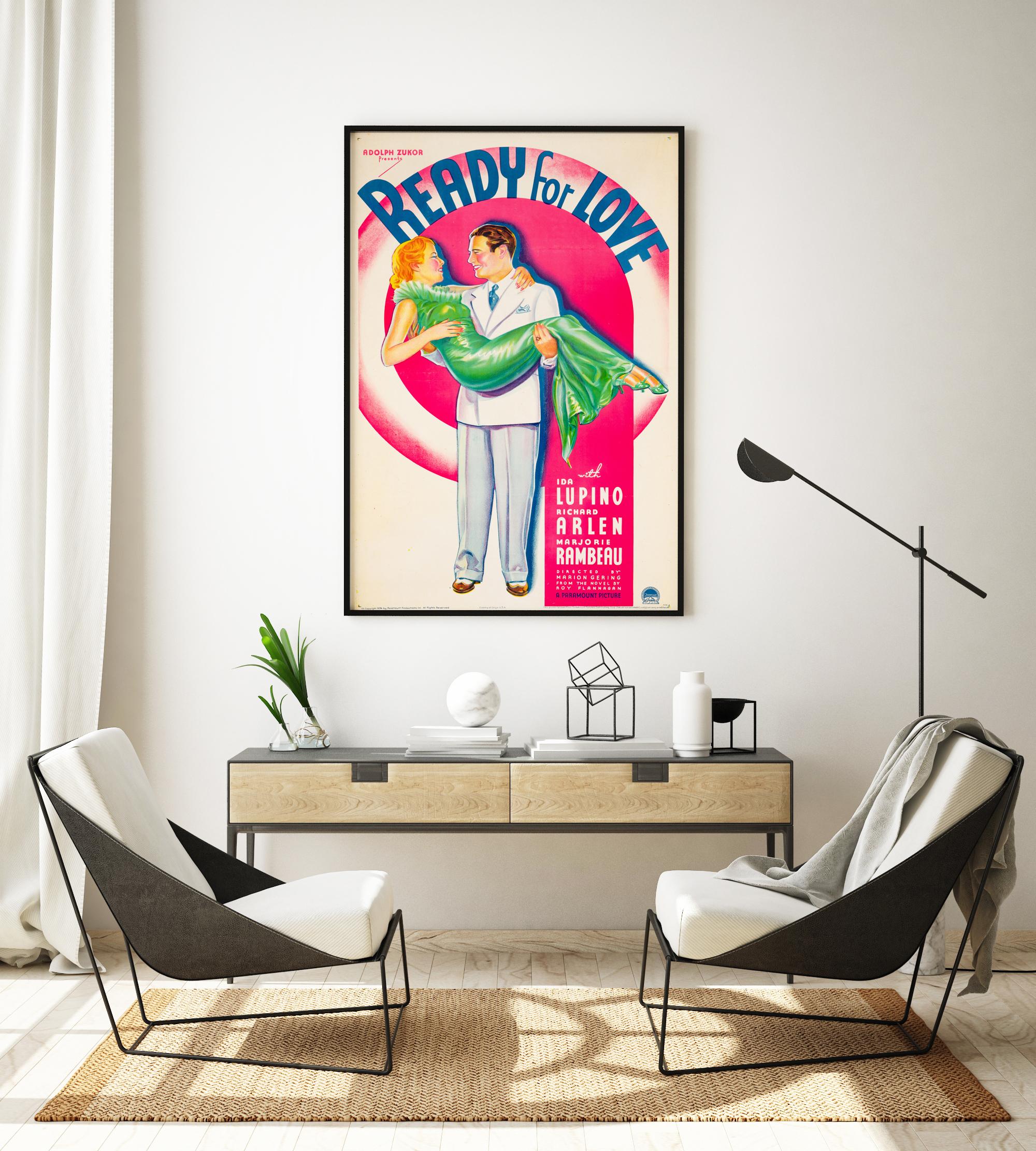 El deslumbrante diseño Art Decó, la tipografía destacada y los tonos rosa caramelo y verde esmeralda, que contrastan vívidamente, se combinan con un efecto irresistible en este raro cartel estadounidense de una hoja para la comedia romántica de 1934 de Paramount Pictures "Ready For Love". La encantadora Ida Lupino interpretó a una fugitiva de un internado que se enamora del apuesto editor de un periódico que llega para cubrir un juicio por brujería en el pequeño pueblo de su tía, y la pareja se dirige a Nueva York para vivir felices para siempre. En particular, la película supuso la primera aparición del perro que luego aparecería como Toto en "El Mago de Oz".