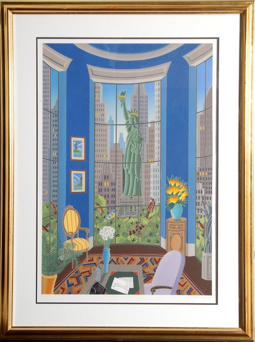 Serigrafía titulada "Sofá azul", del artista Thomas McKnight. La escena representa el salón de un apartamento con vistas a un rascacielos de Manhattan. Colocada en un fino paspartú d...