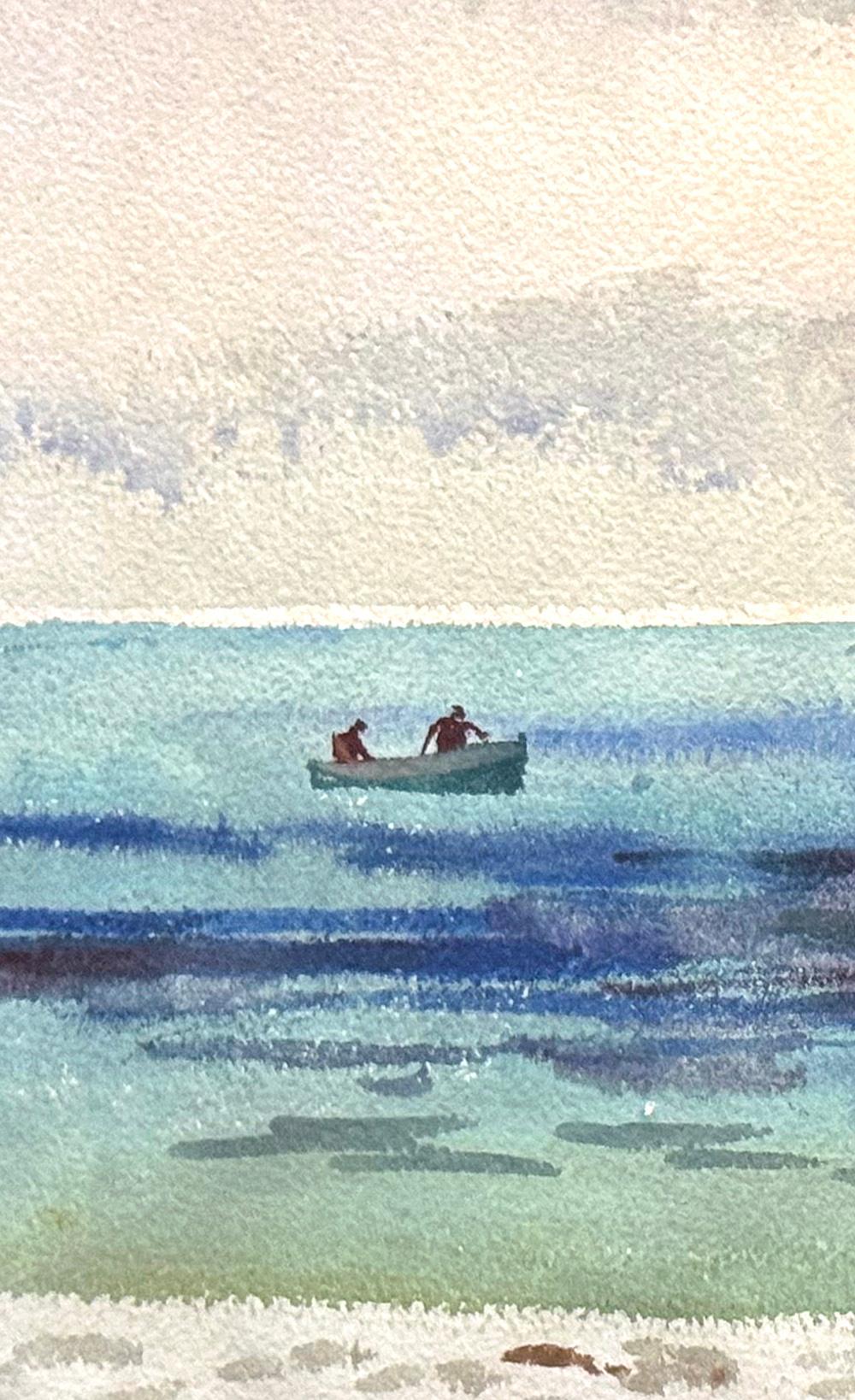 Acuarela original francesa de mediados de siglo de Beg-Meil Escena de playa con bañistas