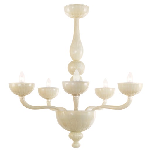 esta araña de cristal de Murano de diseño clásico con soporte central en forma de balaustre invertido y dosel abocinado, todo ello sobre un cuenco de cristal del que salen cinco tall...