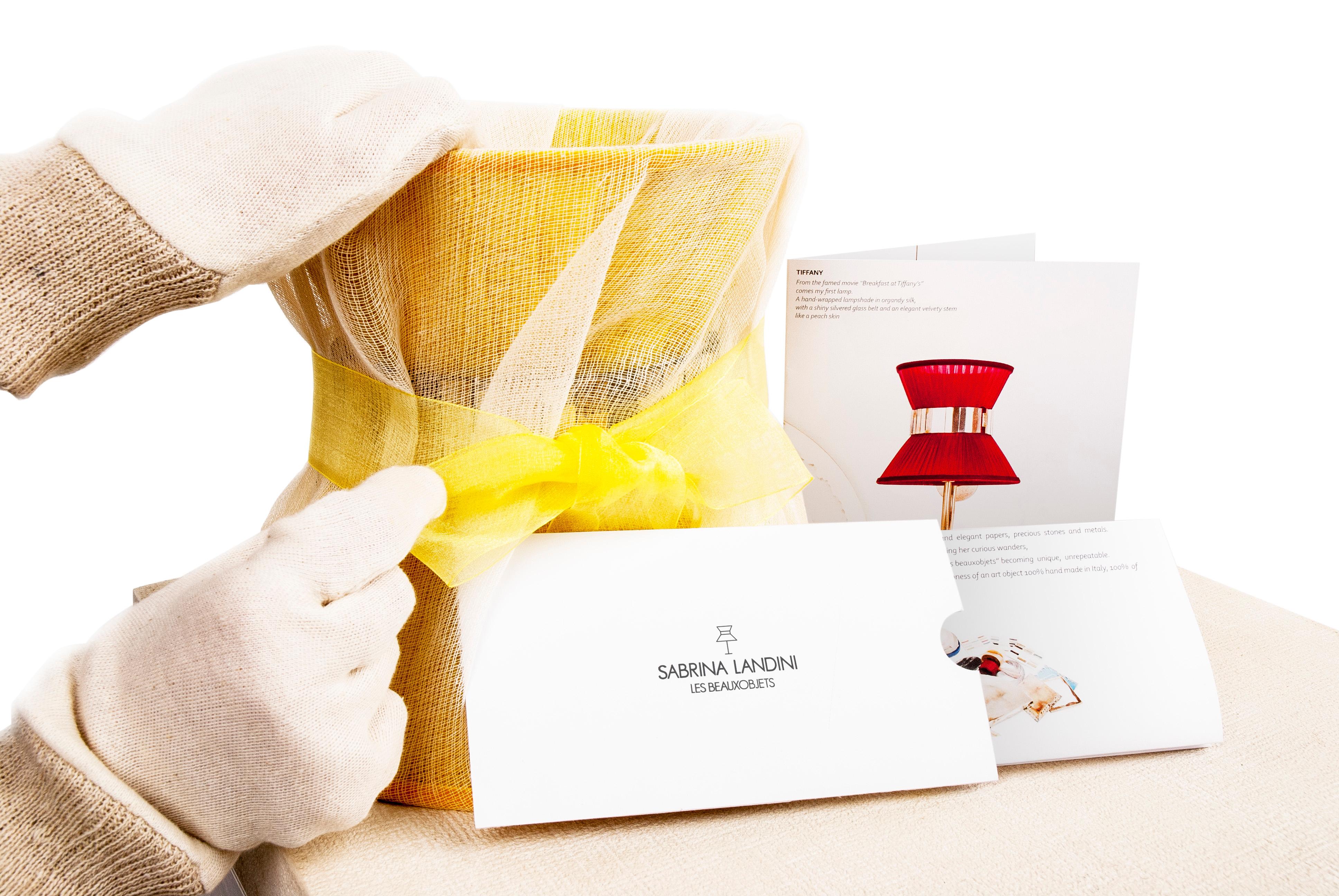 La diseñadora italiana Sabrina Landini es conocida por sus seductores objetos decorativos hechos a mano y por su iluminación . Apoyado por un pequeño equipo de asistentes en la Toscana, Landini crea piezas luminosas y optimistas modernista que reflejan una fuerte feminidad. La elegante serie de luminarias Tiffany de su marca homónima -una célebre línea que incluye lámparas de mesa, lámparas de pie y más- está inspirada en el icónico personaje de Audrey Hepburn en la película de 1961 Desayuno con diamantes .