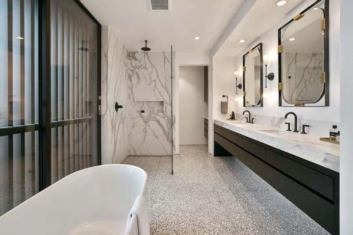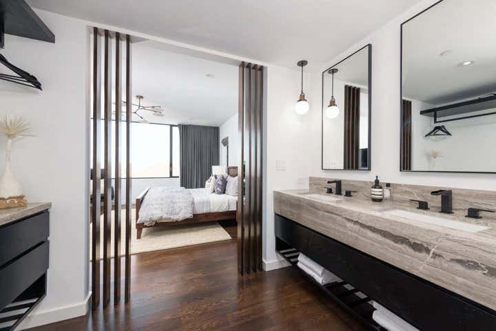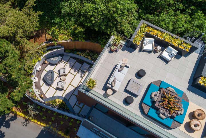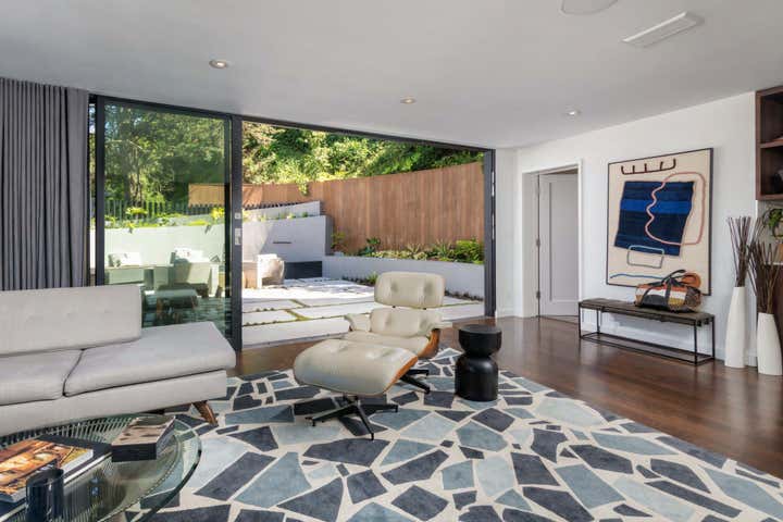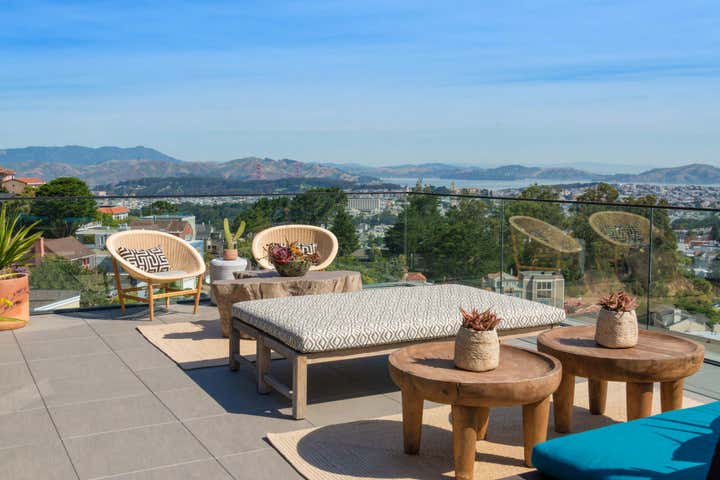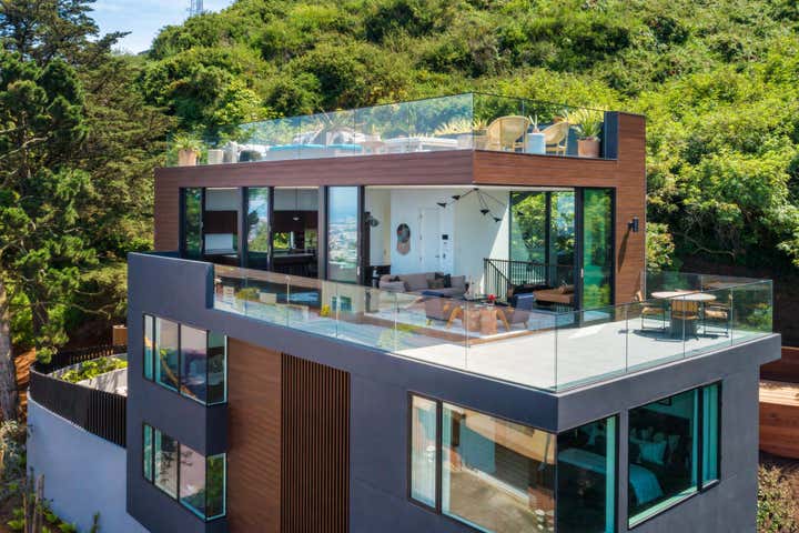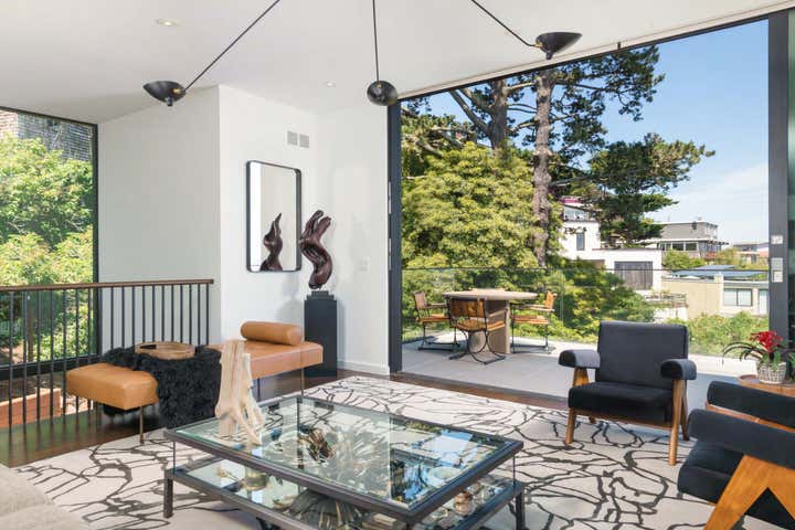Situated on the dramatic slope of Twin Peaks in San Francisco, this single-family home embraces the moody textures created by the large window expanses throughout the house. Combining the warmth of 70’s modern masculine with the structural severity of French industrial design, this 4-level property exudes the best of city living with its breathtaking skyline views and connection to the surrounding hillside.