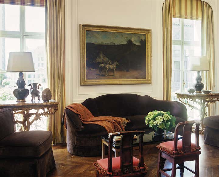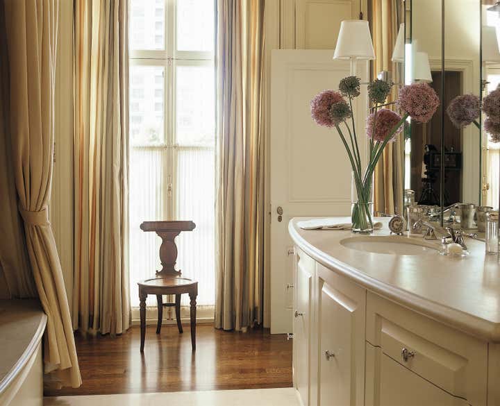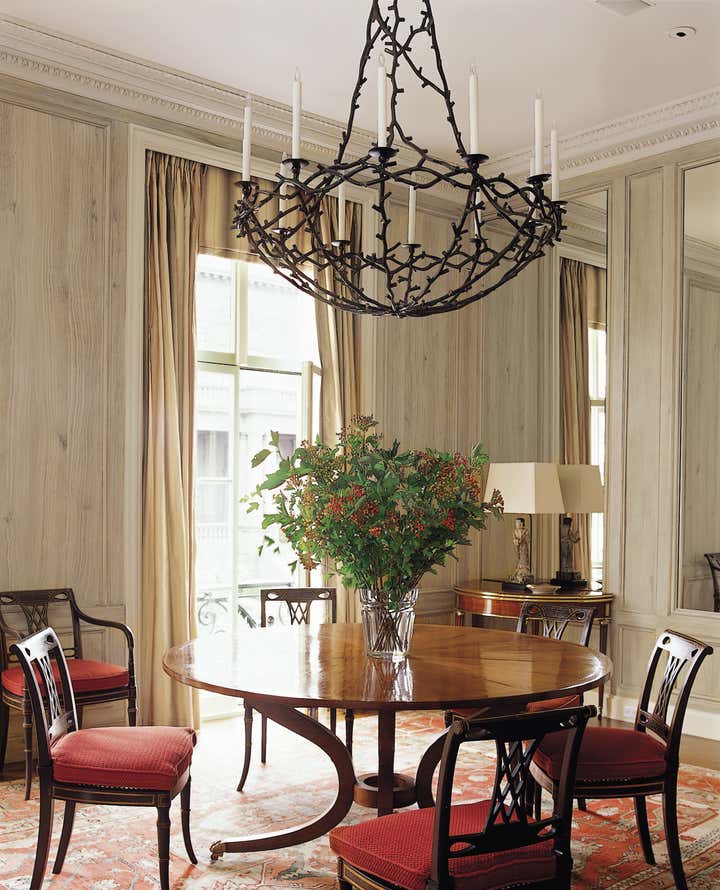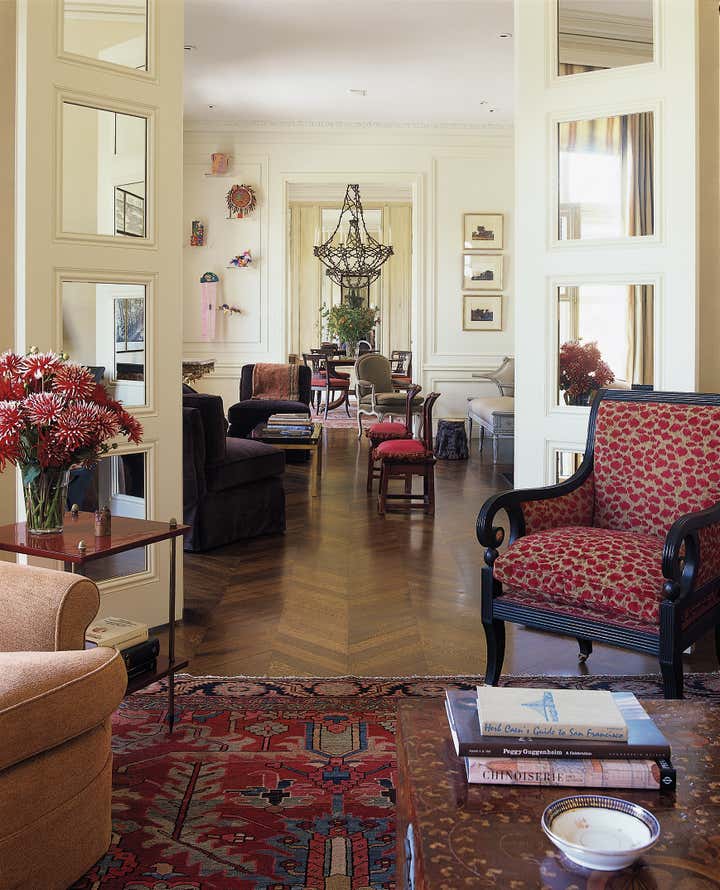 In this 1920 s Nob Hill building, w e designed an apartment for a client with a young daughter who wanted both a comfortable family home and a lavish space for entertaining. The apartment had been substantially demolished; floors, electrical and plumbing systems, and mantels were gone. We retained most of the original wall locations but reconfigured the space by opening the master bedroom to the living room; relocating the kitchen to the previous site of the pantry, maid’s room, and silver closet; creating a family room in what had been the kitchen; and expanding the bath and adding a powder room in what had been a hallway. In the foyer, we installed Chinoiserie murals painted on gessoed, cracked canvas, appropriate for the style of the building. In a bold gesture, we designed a grand series of formal rooms for the main living space, connecting the living and dining rooms, as well as the master bedroom, with pairs of tall, mirrored double doors. The dramatic entertaining space along the front of the apartment, with its two fireplaces, can accommodate large cocktail parties and dinners but also has intimate spots for reading.