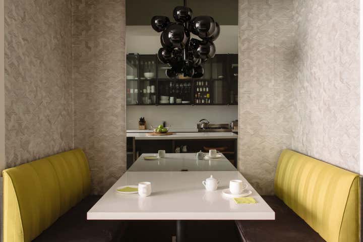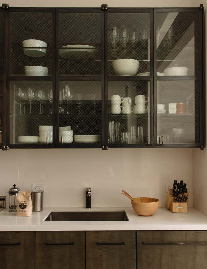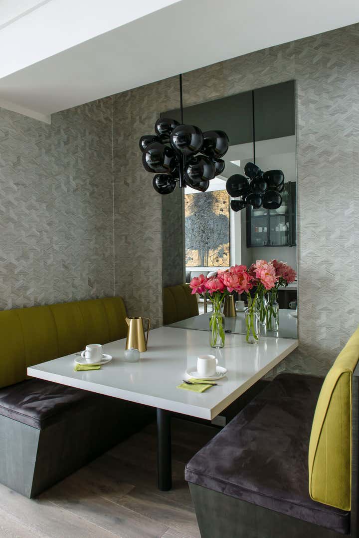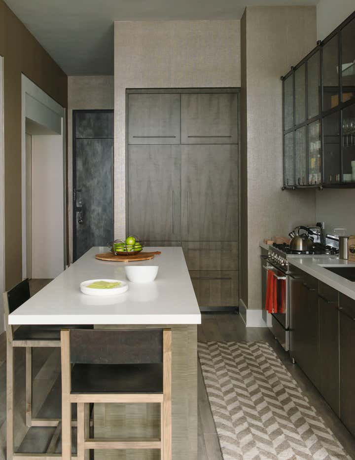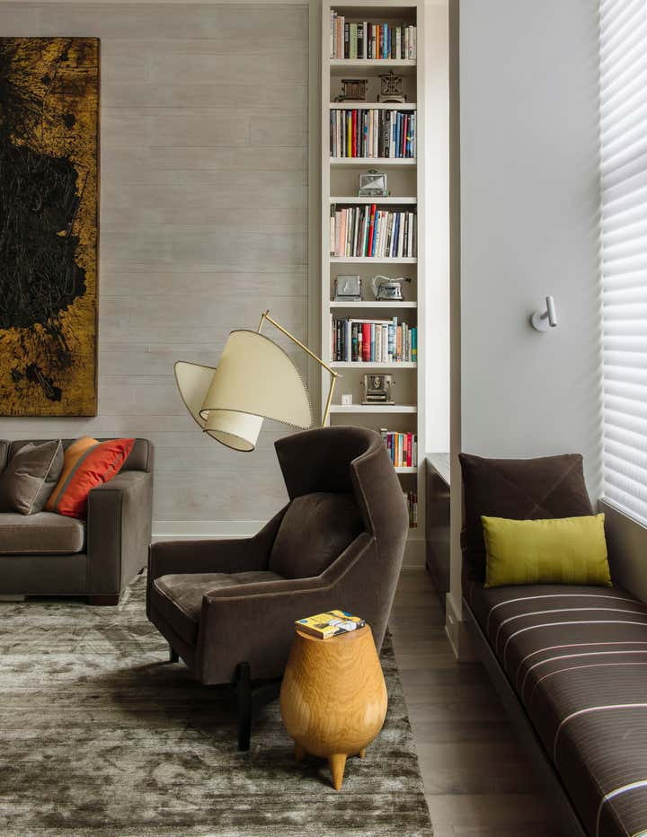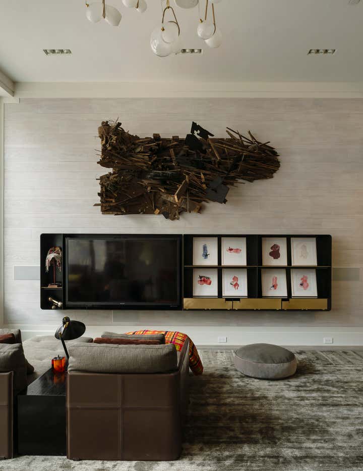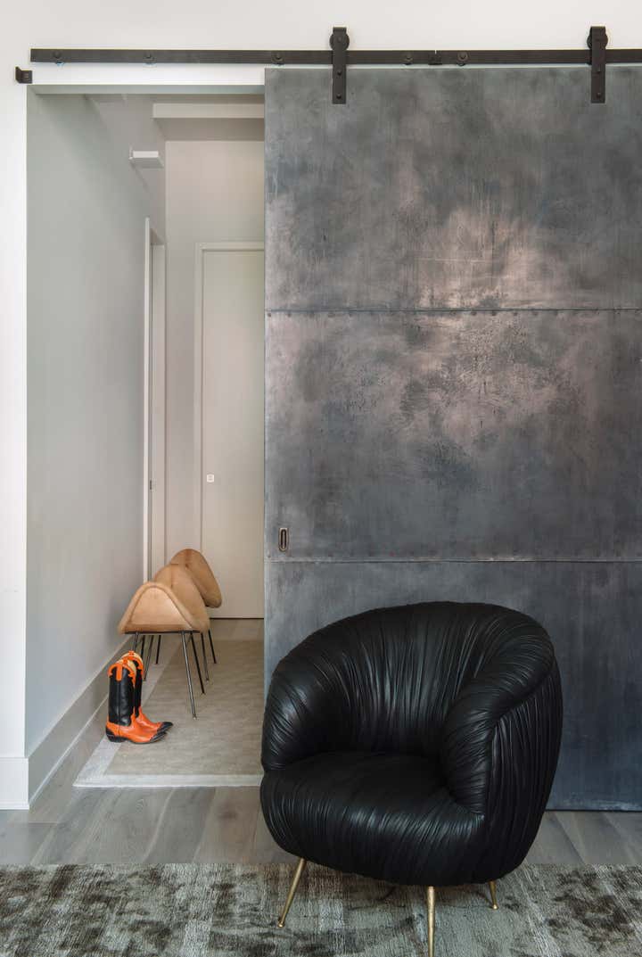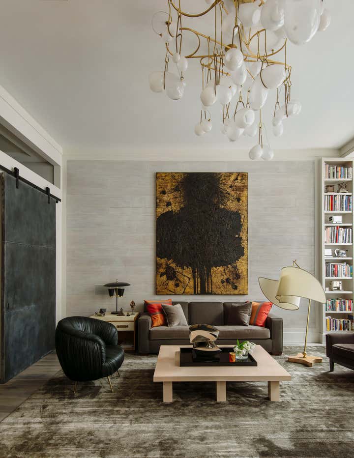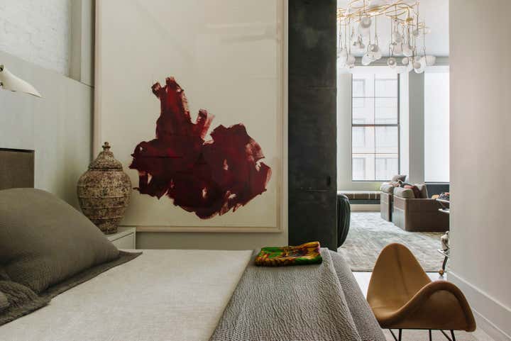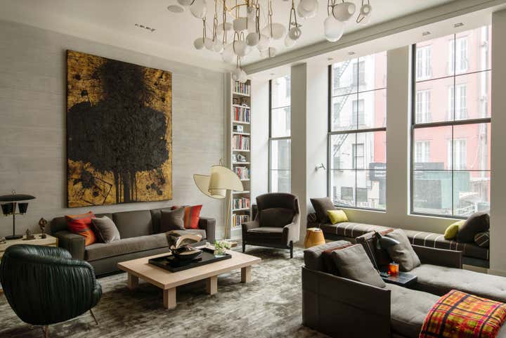 Bond Street Loft is a pied-à-terre with soaring fourteen foot ceilings, sits within a classic cast iron building in the heart of Noho, NYC. It is home to a couple who are serious about their art. DHD worked on this project from the onset of design and construction, allowing for a clear harmony between the architecture and design. The wide plank grey oak floors and white gallery walls set the palette for an art filled environment. A custom designed silk rug fills the main space, while the large-scale Lindsey Adelman light installation hangs above. The furniture, a mix of vintage and classic contemporary, were carefully curated to create a home that is elegant and subtle yet eclectic. The use of cowhide, mohair, woven leather and velvet create subtle textures against the painted brick and wood planked walls.