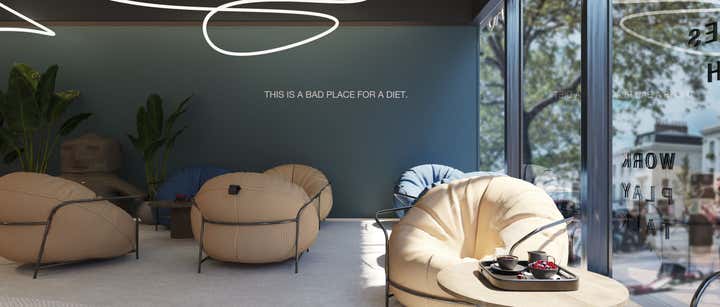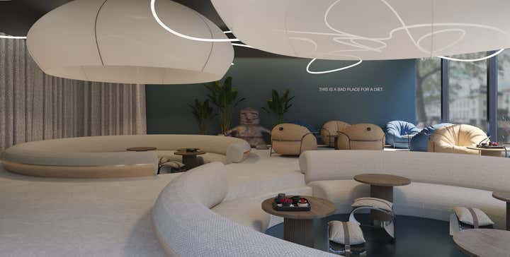 The underlying theme and vision of this commercial design is supreme comfort with a high degree of elegance. How can you achieve that? By using a costume hybrid seating interior design that blends the comfort of a bean bag with the elegance and structure of an armchair. One of the client s main objectives was to accommodate large groups. For this, we explored the idea of using recessed circular banquet seating with a total circumference of 11.2 meters. Unconventionally bent led lighting was used, this added a layer of extra style through this uniquely unorthodox technique we like to use.
