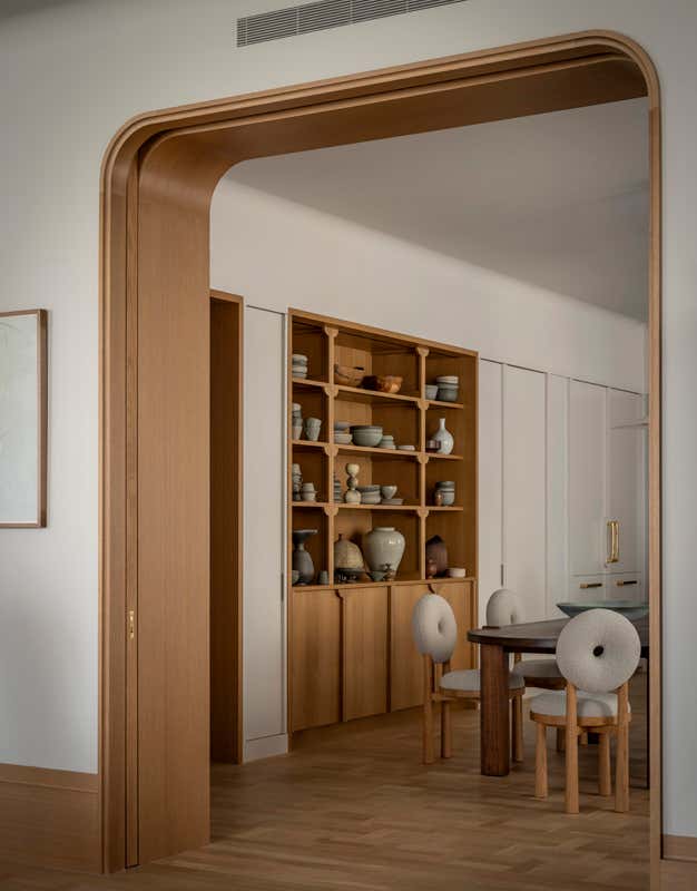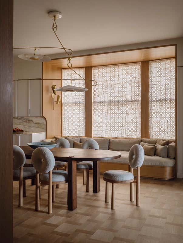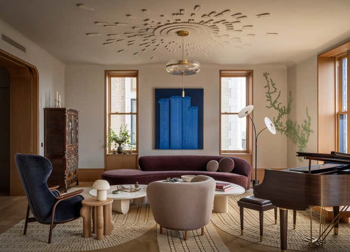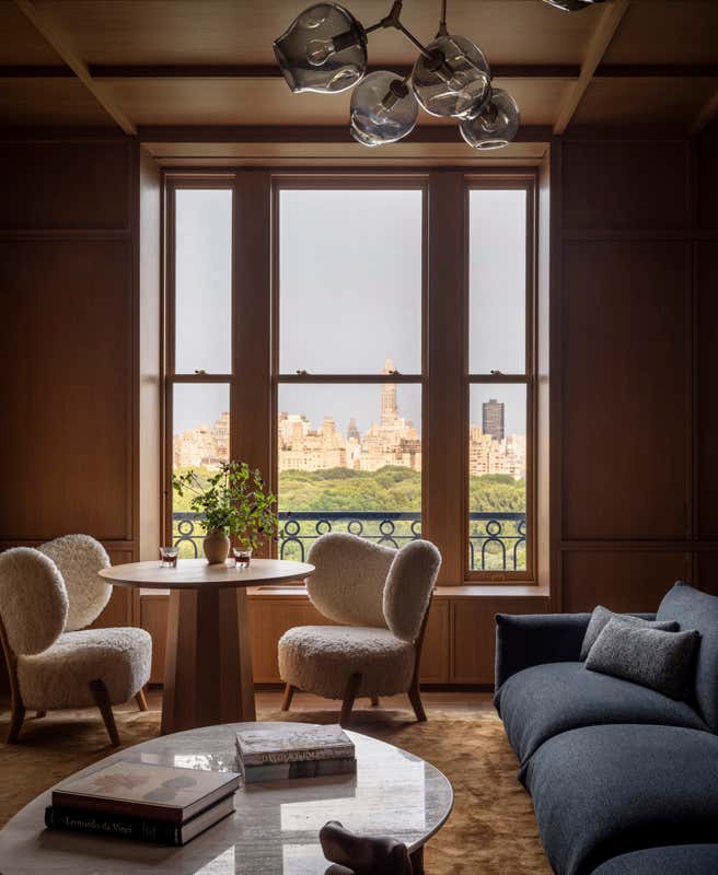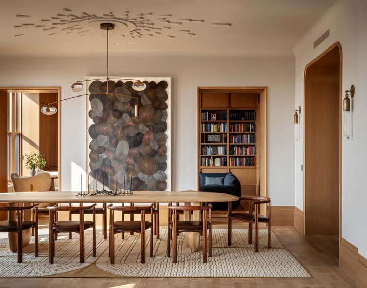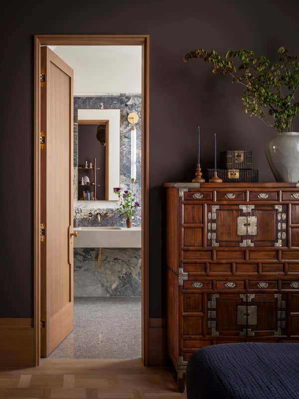 Our Korean client wanted her culture reflected in their home, which we delighted in doing throughout. The chrysanthemum, which is a recurring motif in Asian art, was also incorporated in the ceiling roses, rugs, lighting, and the mosaic floors. In addition, beautiful bojagi textiles by Korean artist Wonju Seo were commissioned, our office designed the falling gingko leaf brass and walnut inlay at the bar, and Korean antiques intermingled with modern furnishings. The result is a calm haven that floats above the park. A retreat for our clients to recharge from their busy lives.
