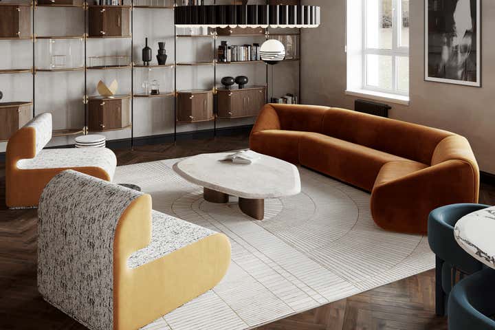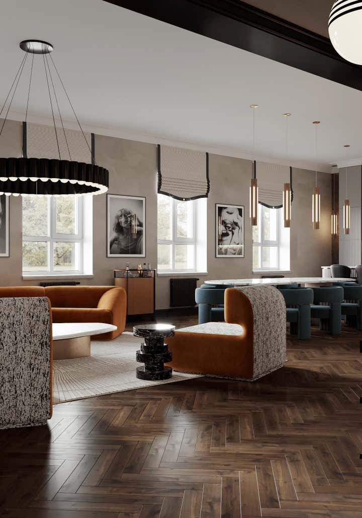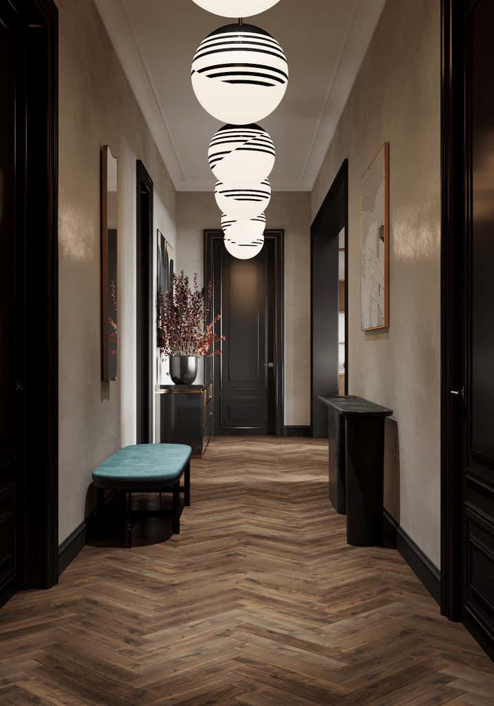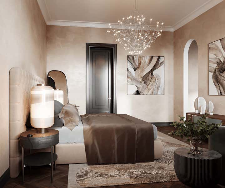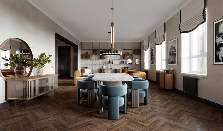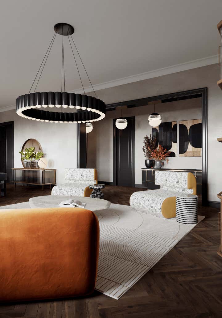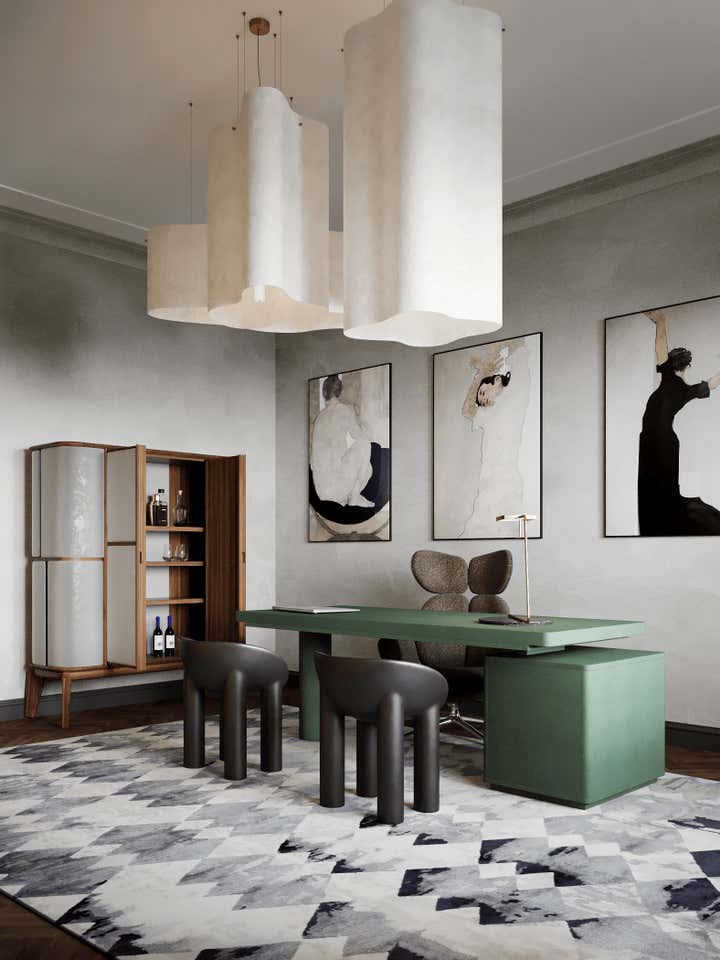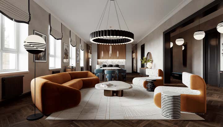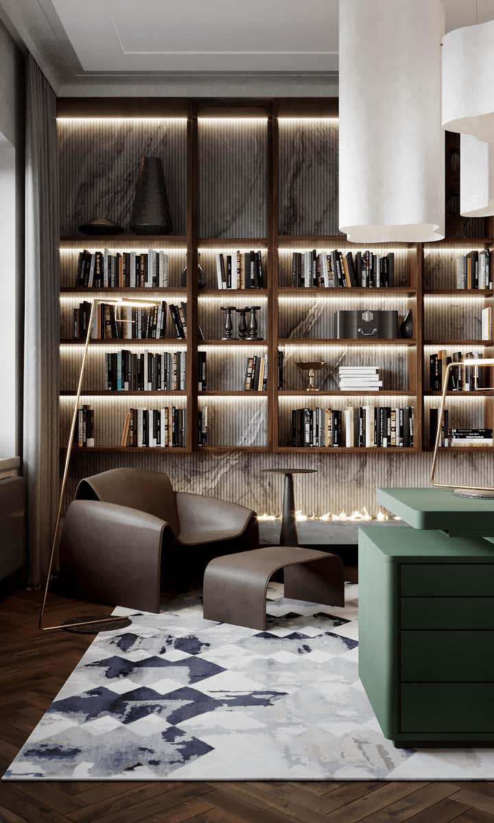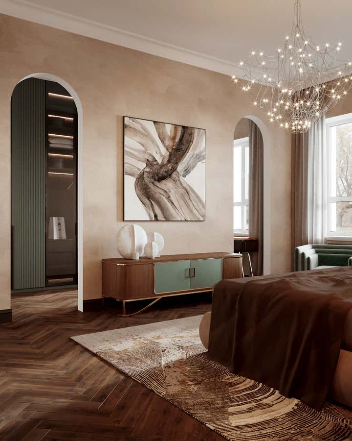 Sophisticated interior design project within a Georgian building in Chelsea, London. Created for a discerning couple, the design harmoniously blends classic architecture with a modern, French-inspired aesthetic. The space amplifies the Georgian high doors and ceilings for an increased sense of grandeur. Each room is distinctly styled, with a warm peach-coral bedroom and a serene forest-green study. The lighting, primarily Lee Broom fixtures, unifies the space, complemented by oak wood details and elegant furniture from renowned designers such as Fendi, Fabrice Juan, and Baxter. Accents from Kelly Wearstler, including a beige geometric carpet and side tables, contribute to the apartment s eclectic vibe. The resulting space is a chic, modern oasis celebrating its Georgian roots.