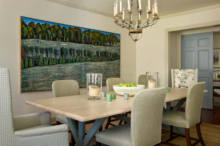 The goal of this project was to renovate a 1930’s farmhouse style home in Washington DC and turn it into a family friendly home that feels like a retreat from city living. While the home is in the middle of DC, it is surrounded by woods and parkland and the extensive property includes vegetable gardens, bee hives and bat houses- and a large pool. The clients have a collection of Americana furnishings, sculpture and paintings, which include the atmospheric colors of Wolf Kahn’s impressionistic paintings and the whimsy of Grandma Moses’ works. We kept the traditional farmhouse style, but chose a light and cheerful color palette. We wanted to keep the interiors light and airy and aimed for an almost shaker simplicity in some rooms. The client loves light blues and lavenders. Paul Sherrill chose to use blue doors throughout the house to create a repeating architectural feature. Landscape Architecture: Arentz Landscape Architects Architect of addition: Barnes Vanze