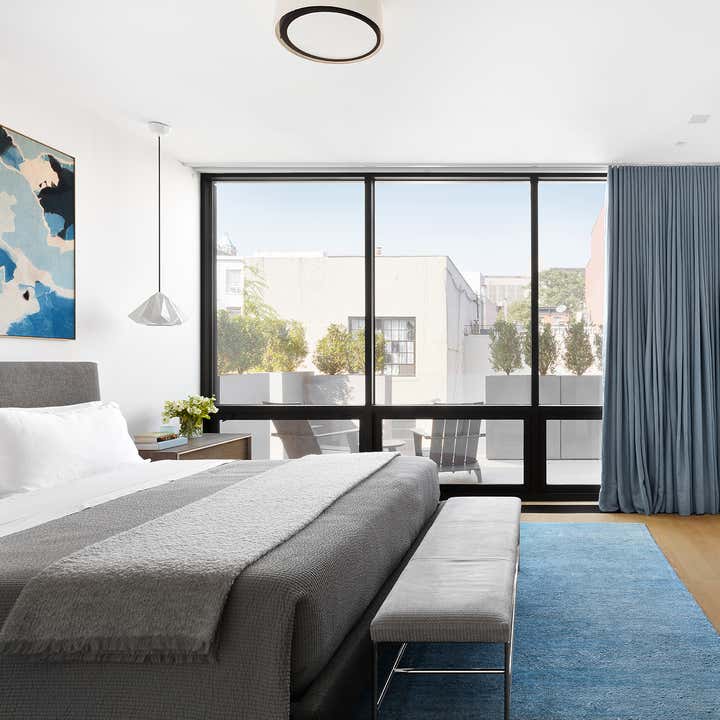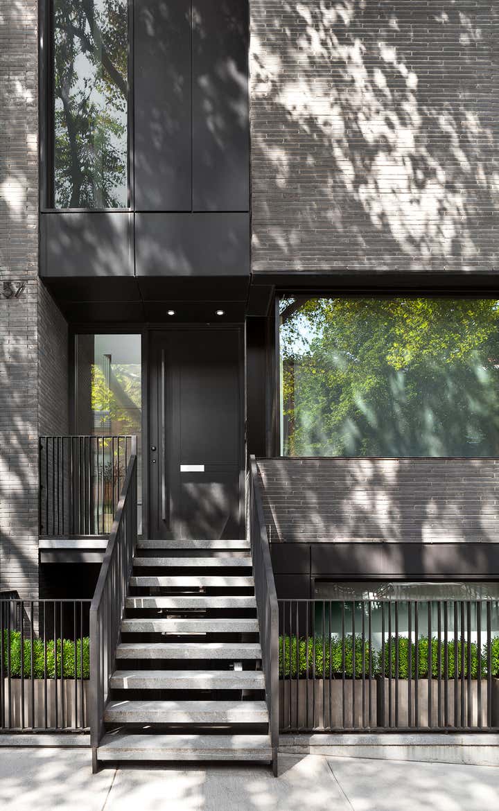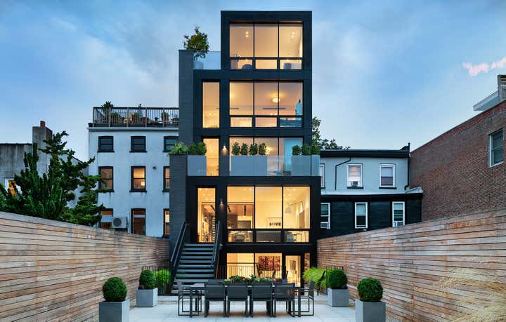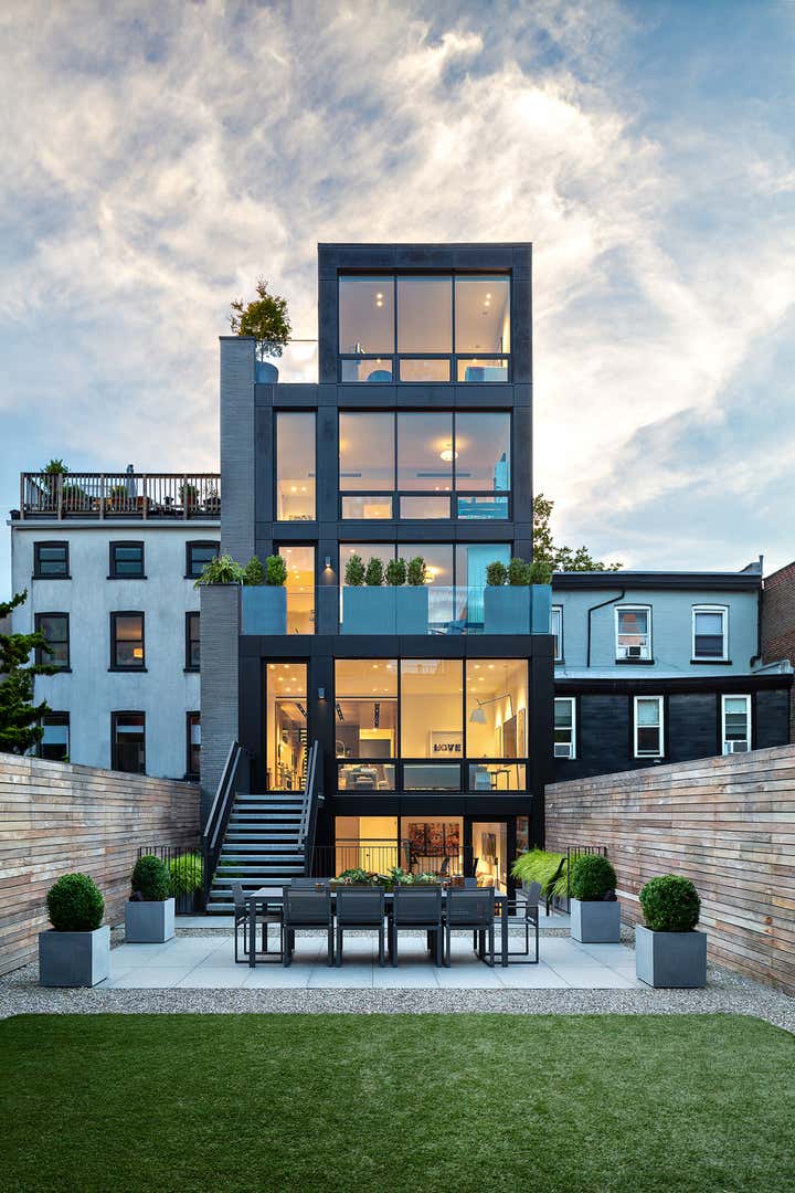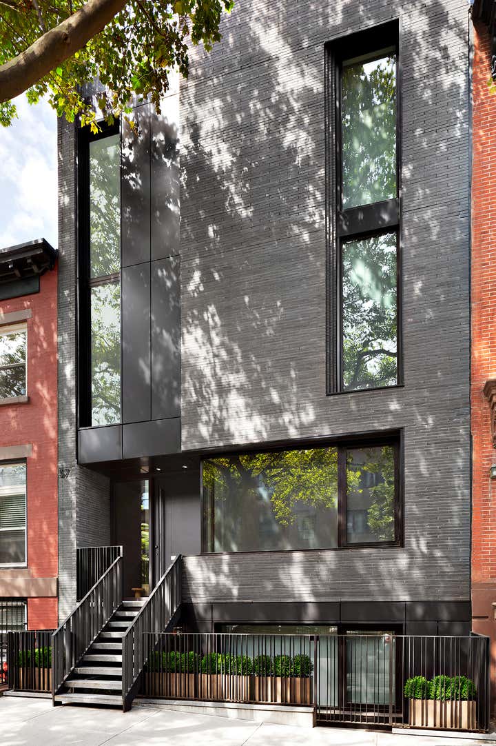 Nestled between two classic 1900s buildings on a leafy Brooklyn street, this ground-up townhouse embodies the ever-changing neighborhood’s energy with a forward-thinking design in Belgian brick, glass and steel. The family home features bright, comfortable rooms that take full advantage of the spacious lot’s light and views, a jaw-dropping chef’s kitchen, and a penthouse studio and terrace with a modern jacuzzi.