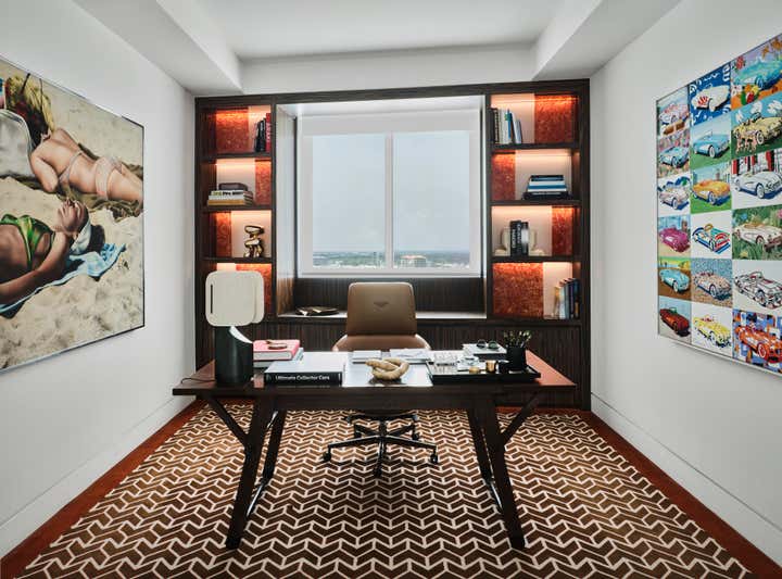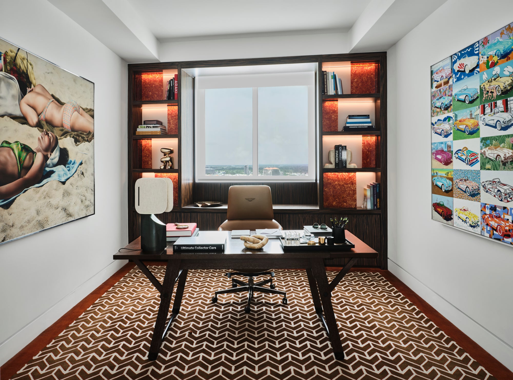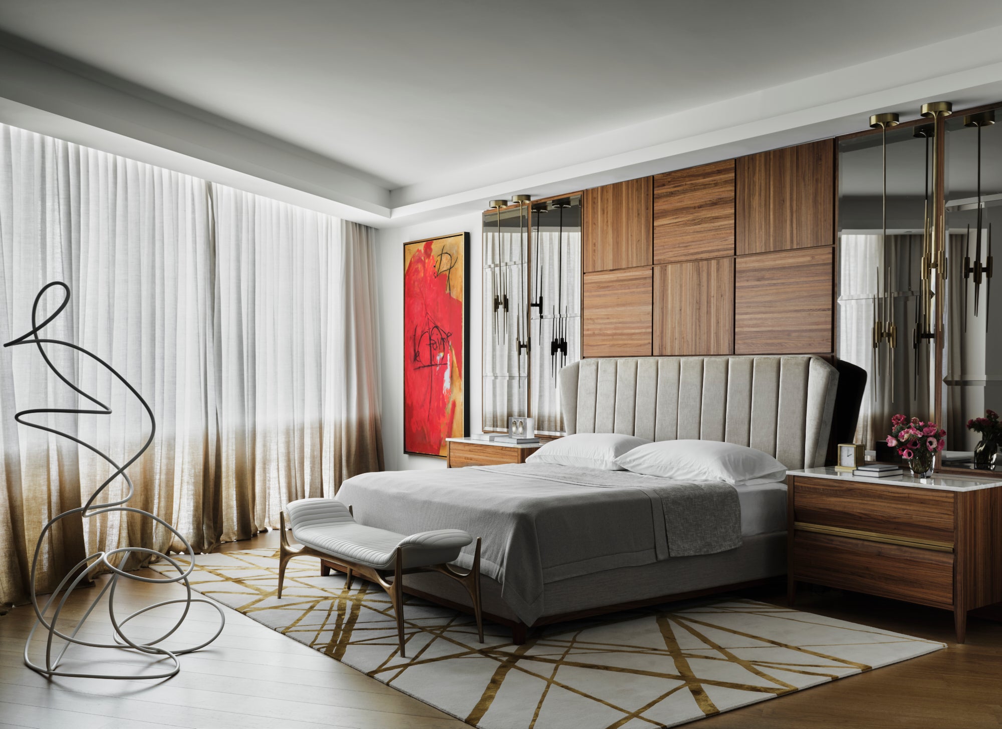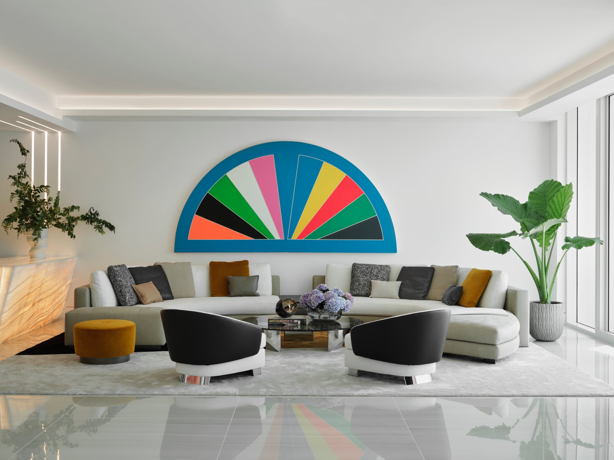 Carefully emphasizing the art in each room while balancing the aesthetic to feel welcoming and personal took methodical design consideration from Feldman’s team. Architectural enhancements from recessed lighting to custom millwork elevated the apartment’s layout to look and feel refined with a minimalist approach. Sculptural furnishings, playful colors, patterns, textures, and luxe finishes play supporting roles to the notable art that becomes the protagonist in each ambiance. The eye does not need to travel far in this remarkable residence to encounter renowned artists from Frank Stella in the living room and the Donald Judd in the dining room to the Damien Hirst, Lichtenstein, and Anish Kapoor.