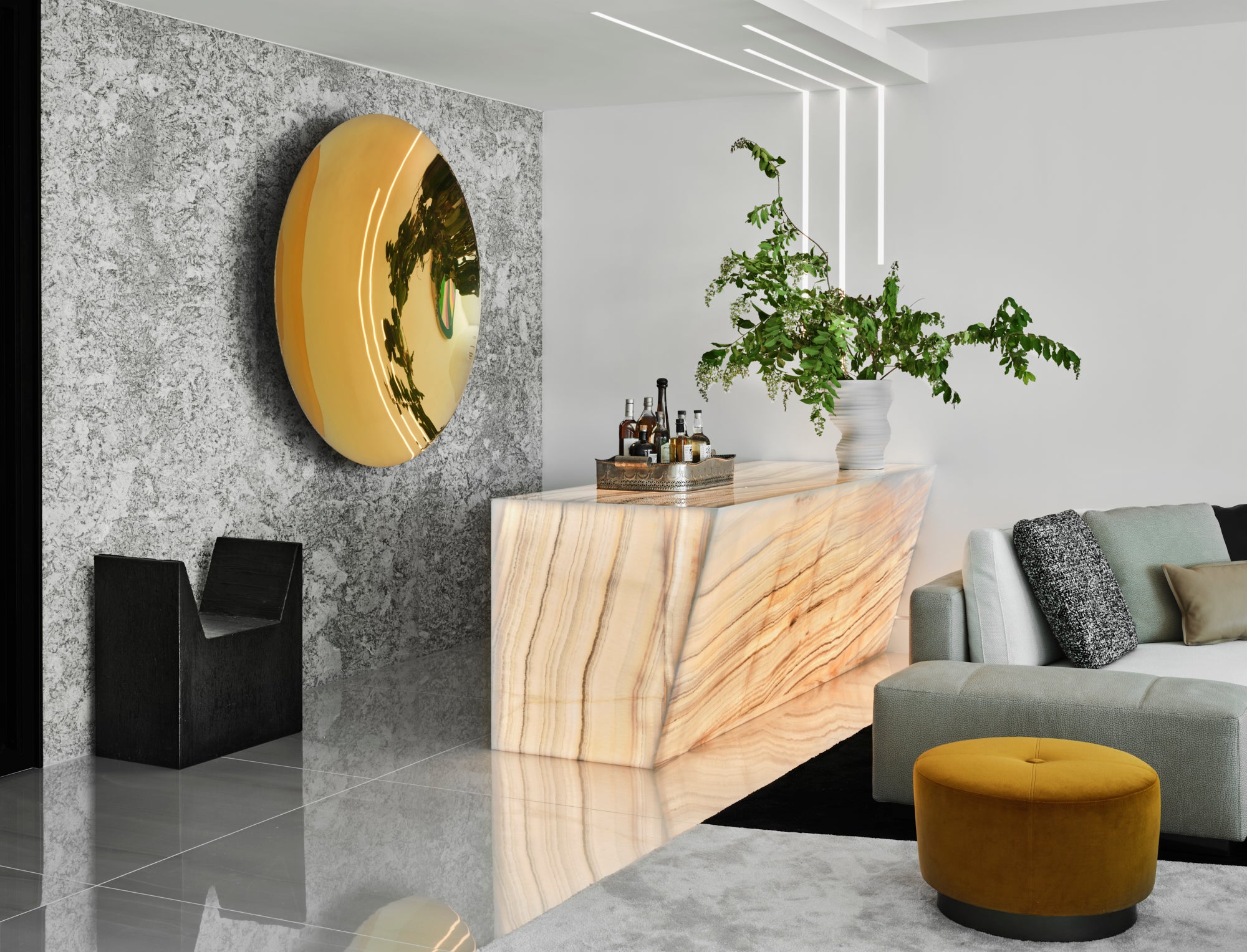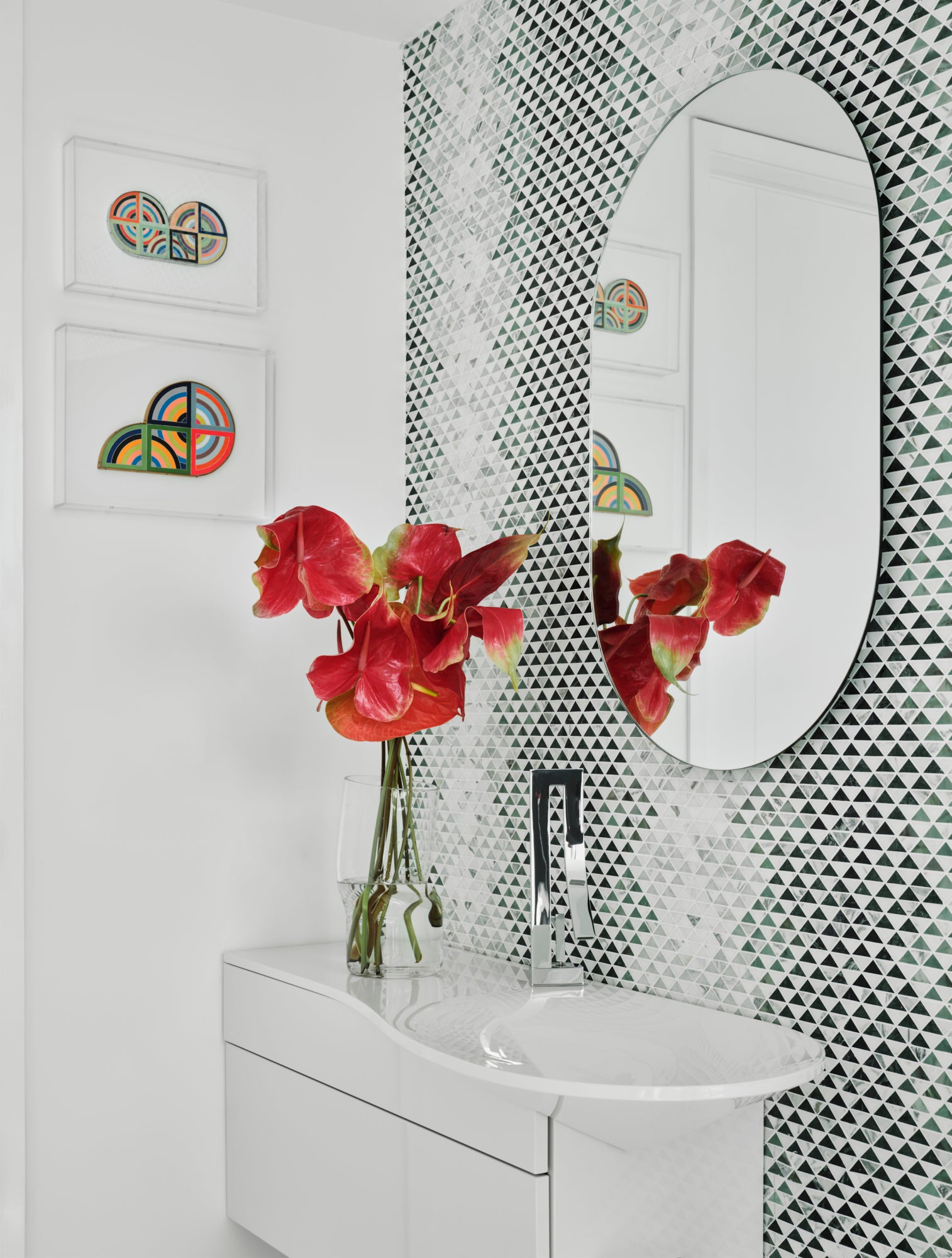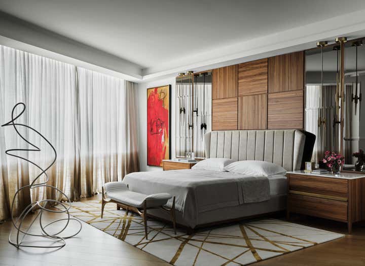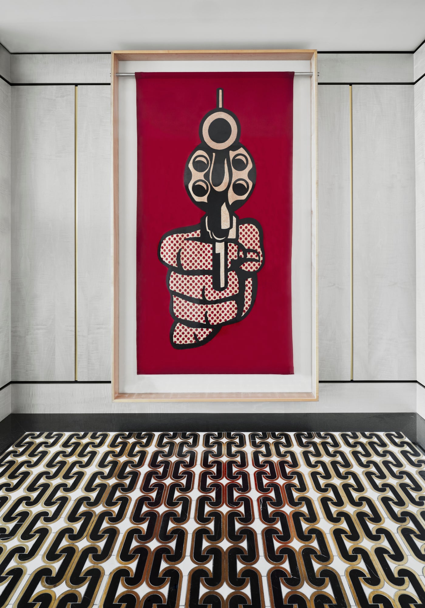 Carefully emphasizing the art in each room while balancing the aesthetic to feel welcoming and personal took methodical design consideration from Feldman’s team. Architectural enhancements from recessed lighting to custom millwork elevated the apartment’s layout to look and feel refined with a minimalist approach. Sculptural furnishings, playful colors, patterns, textures, and luxe finishes play supporting roles to the notable art that becomes the protagonist in each ambiance. The eye does not need to travel far in this remarkable residence to encounter renowned artists from Frank Stella in the living room and the Donald Judd in the dining room to the Damien Hirst, Lichtenstein, and Anish Kapoor.