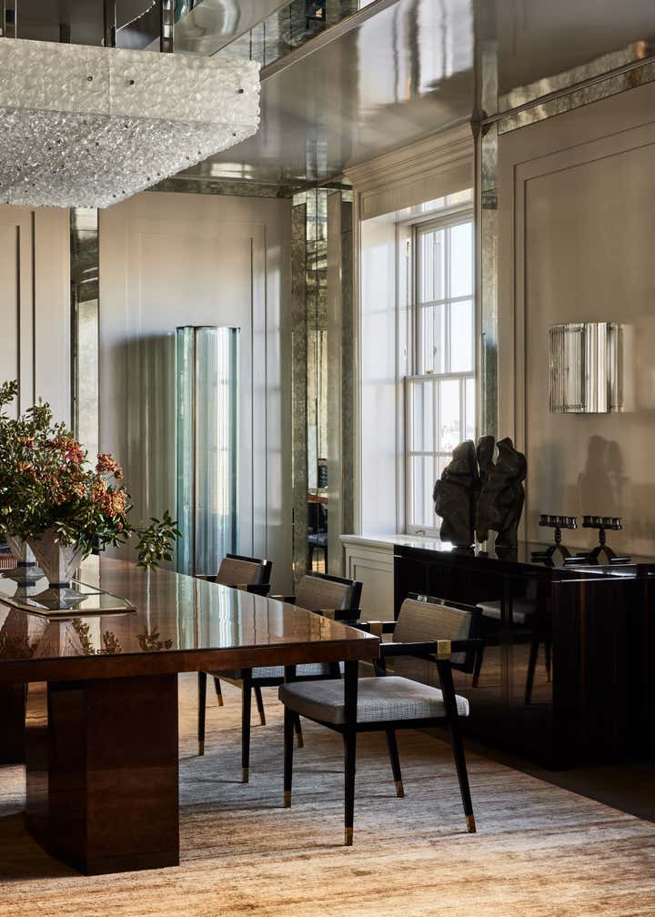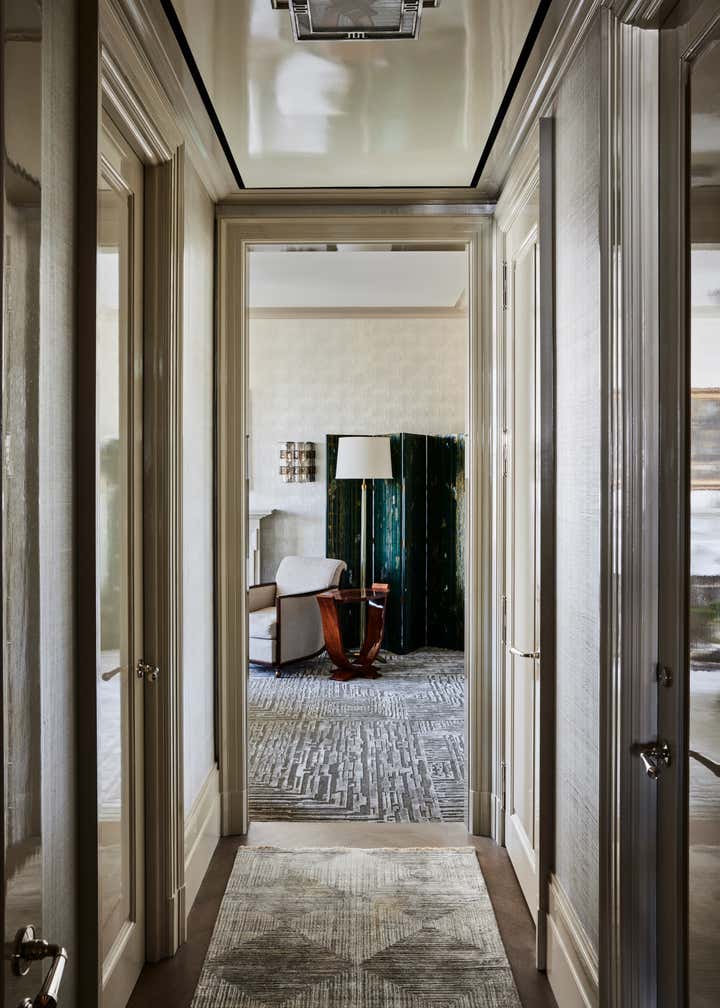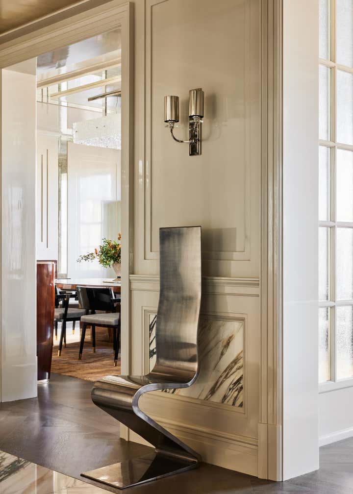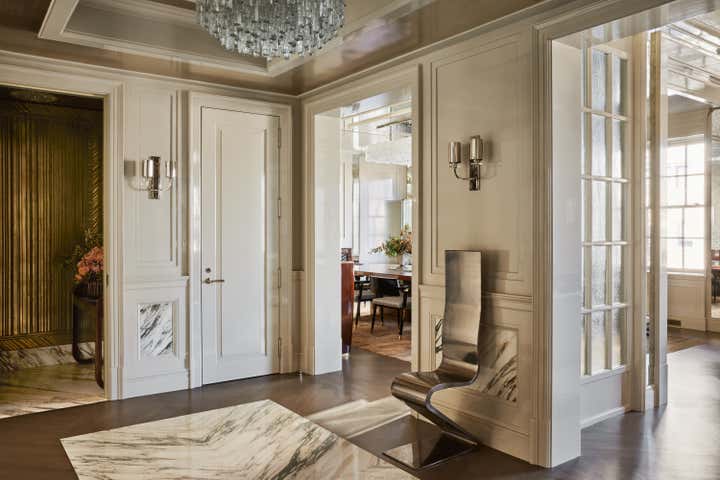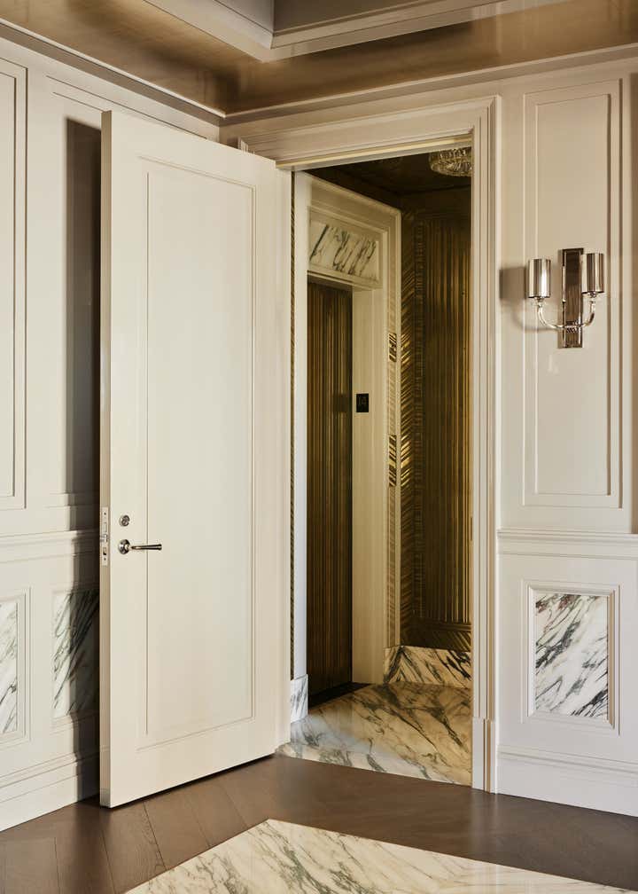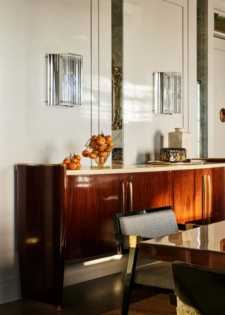No detail left unconsidered, this residence shimmers with refined elegance. Cool and crisp tones meet warm and luxurious, in a delicate counterpoint. Rare wood species, polished paneling, luminous lacquer, and nickel plating speak in harmonious dialogue. Art Deco influences of gilded accents and geometric forms lend enduring allure. The past and future meet in this shimmering ode to fine materiality and glamor.