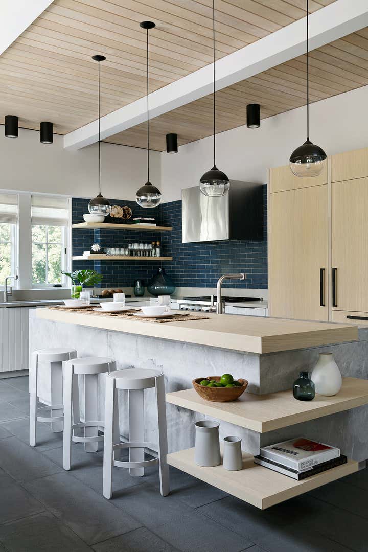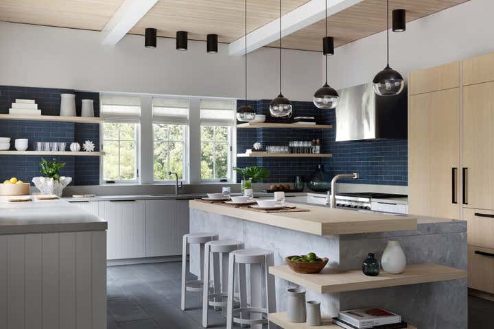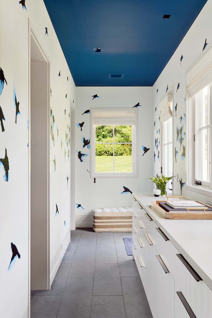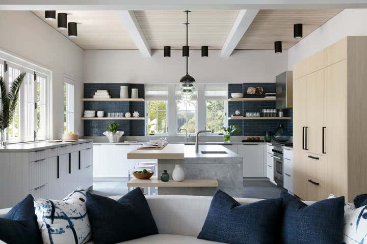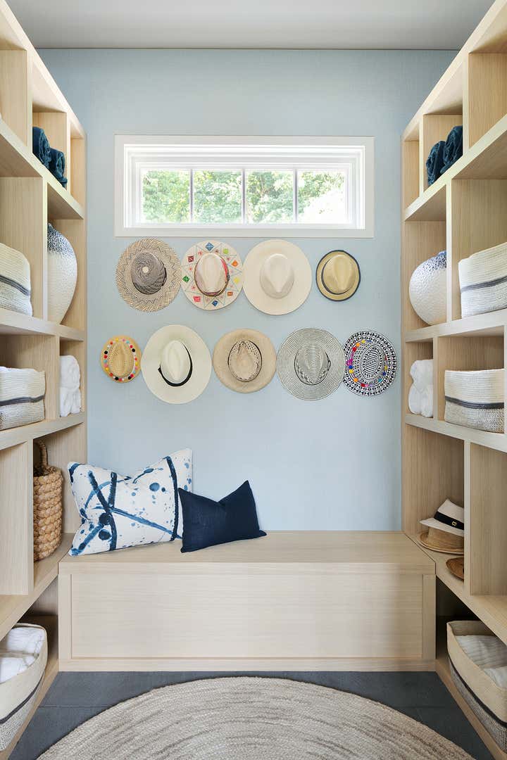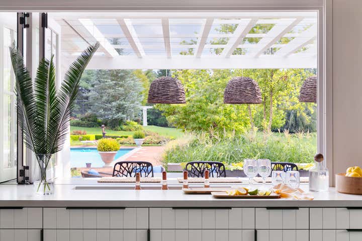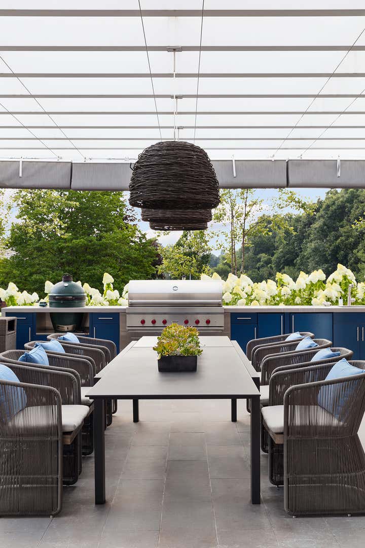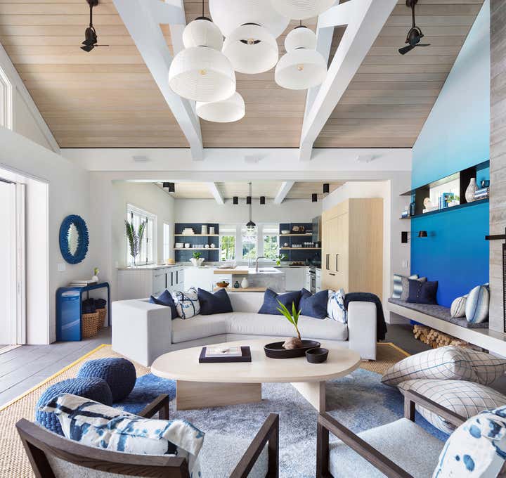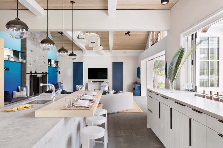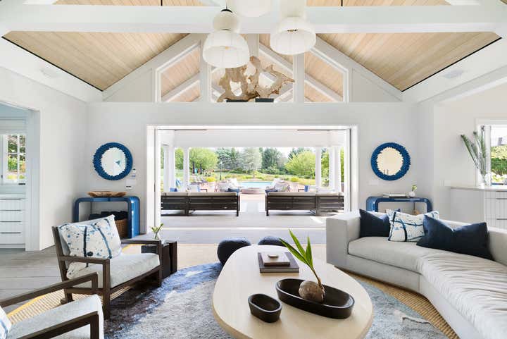 The vibrant interior design for the pool house of a Long Island, NY family home features inviting indoor-outdoor spaces for dining, entertaining and relaxing. A cool, coastal blue and textured, neutral palette sets the scene for a playful eclectic mix of furnishings and decor. Features include indoor and outdoor kitchens, a custom mudroom with storage, laundry, and a full bathroom and changing as well as an outdoor shower.