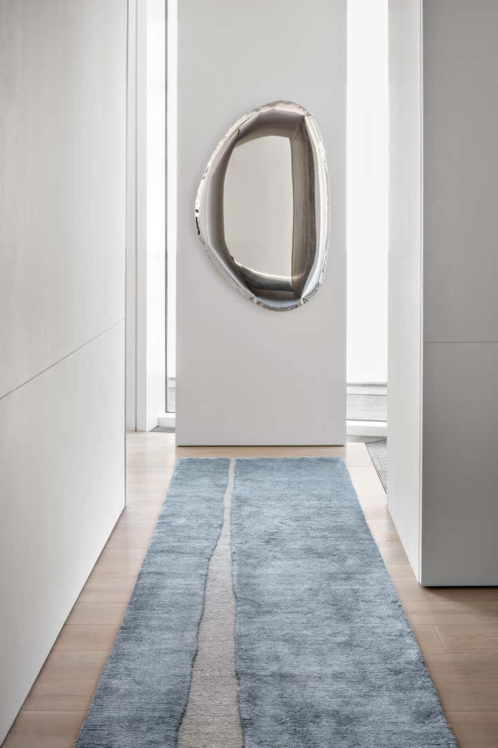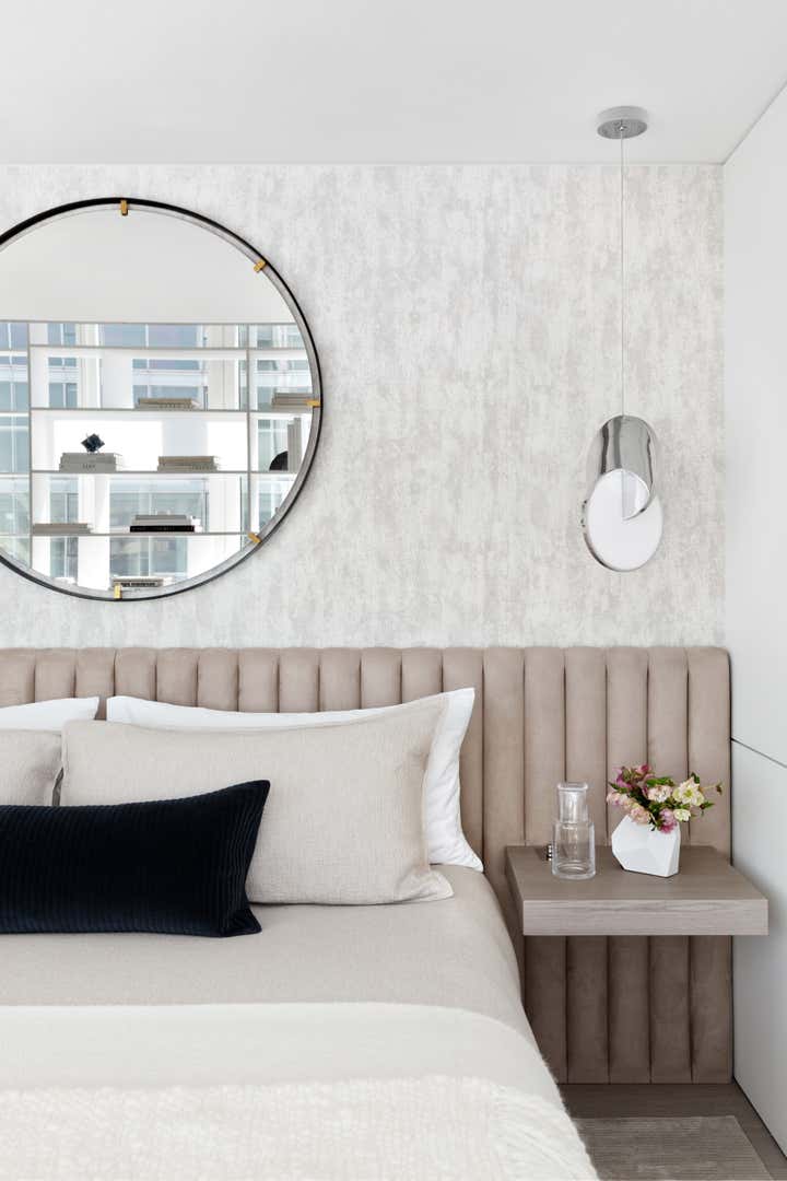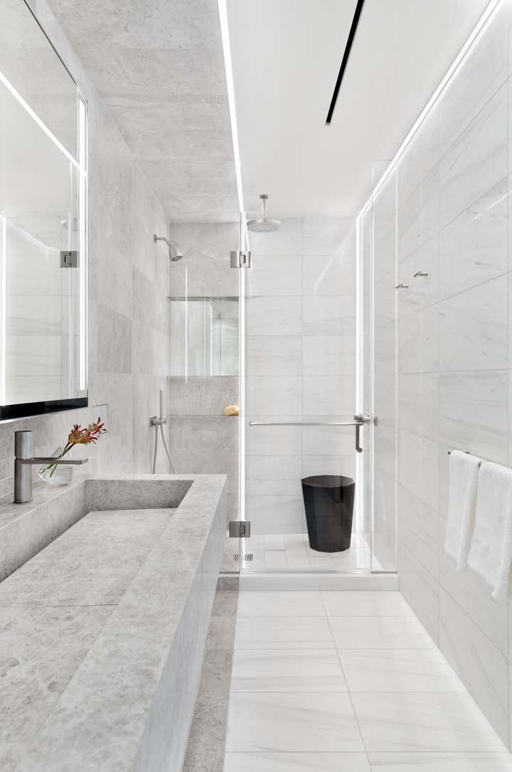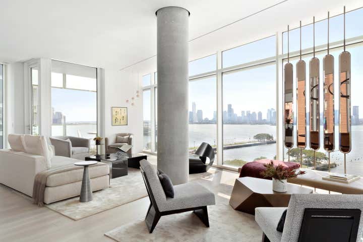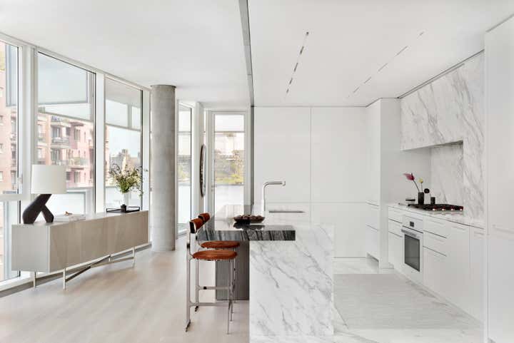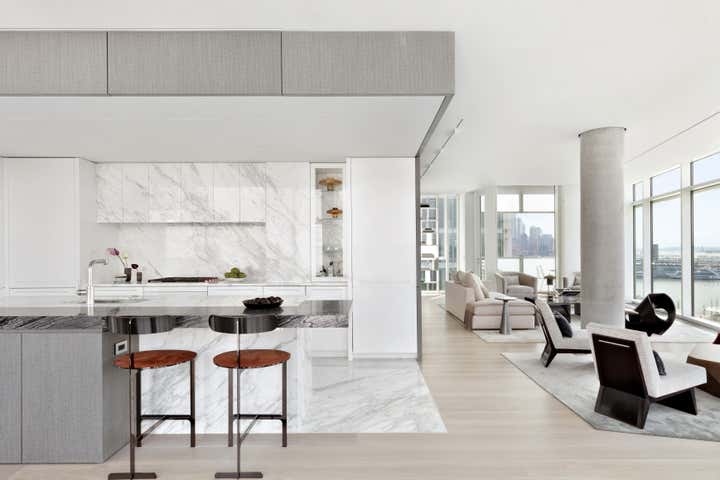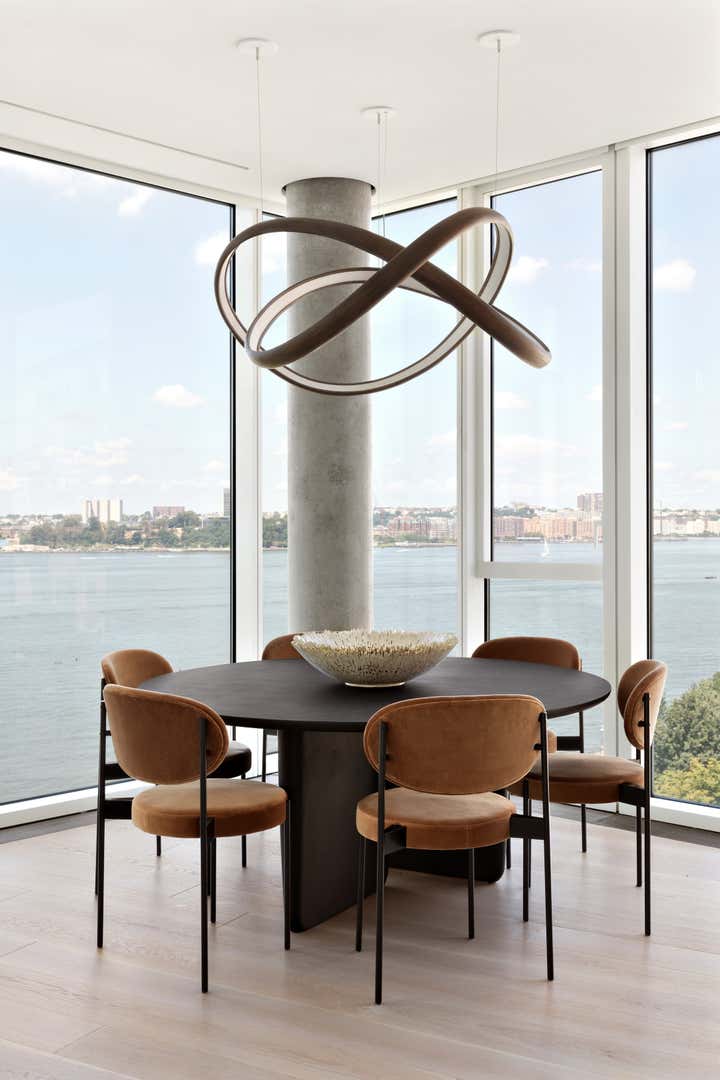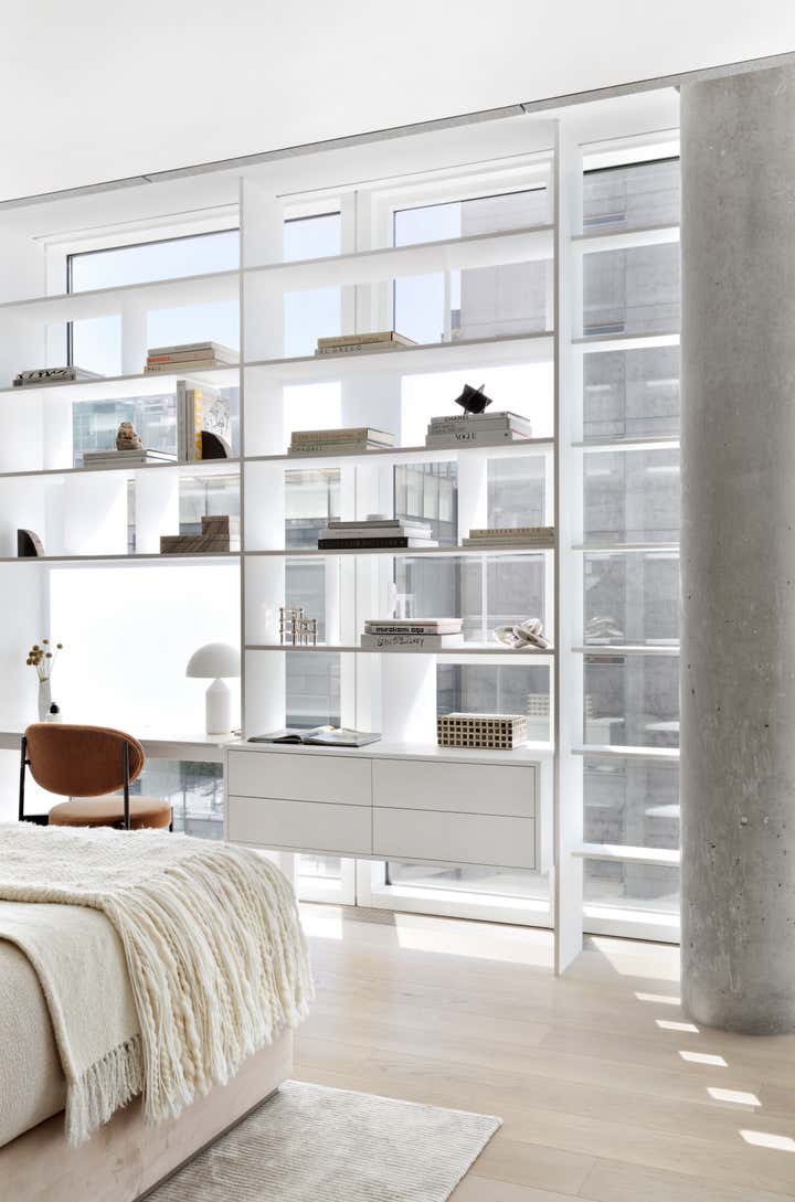 An effortlessly modern Greenwich Village pied-à-terre takes full advantage of sweeping Hudson River views with a clever, flexible design. Private spaces are contained within a central core, signaled by subtle shifts in material and ceiling height to create intimacy and comfort. In the apartment’s public areas, a custom corian shelving system and custom artwork help to fram views and focus sightlines.