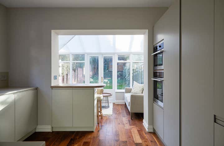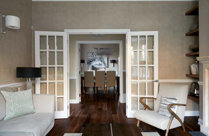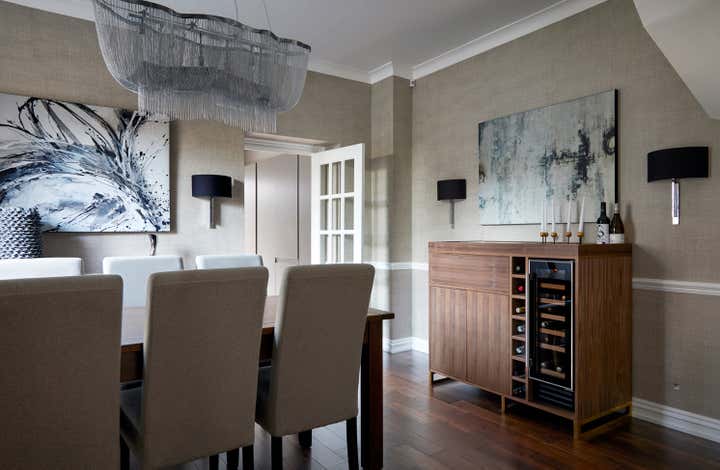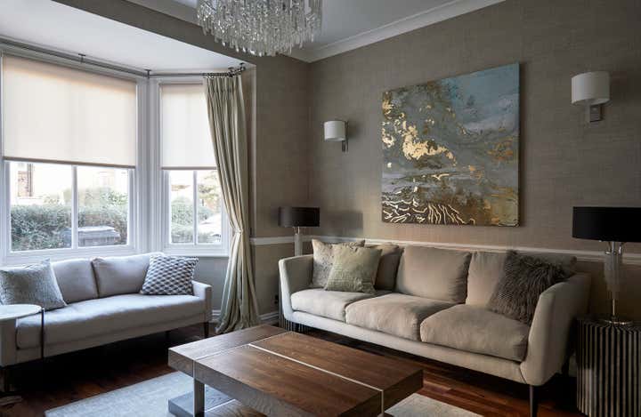 Transform a newly purchased 3 bedroom semi-detached home from a dated shell to a sophisticated, modern residence. The lounge focuses on merging the traditional features of the building with modern styling. Warmer tones and more natural fabrics make this a more relaxed, yet still formal space. The design scheme pulls the conservatory room into the kitchen, making it feel like part of the house, rather than a tacked-on addition, whilst maintaining its link to the garden.