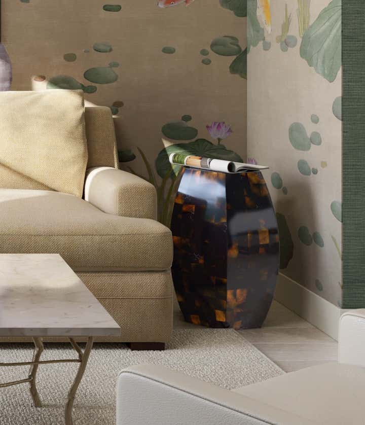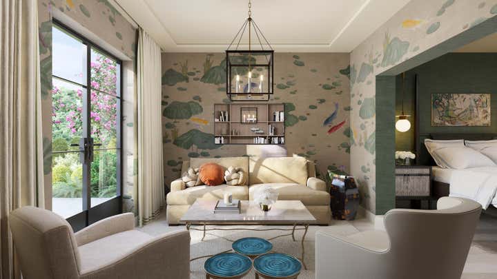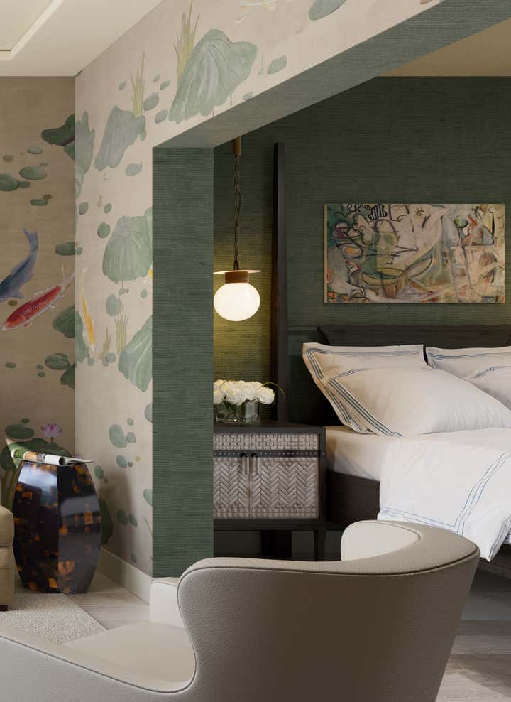 A lovely light filled guest suite in Denver. Silk koi pattern wallpaper compliments the green grass cloth wall covering.