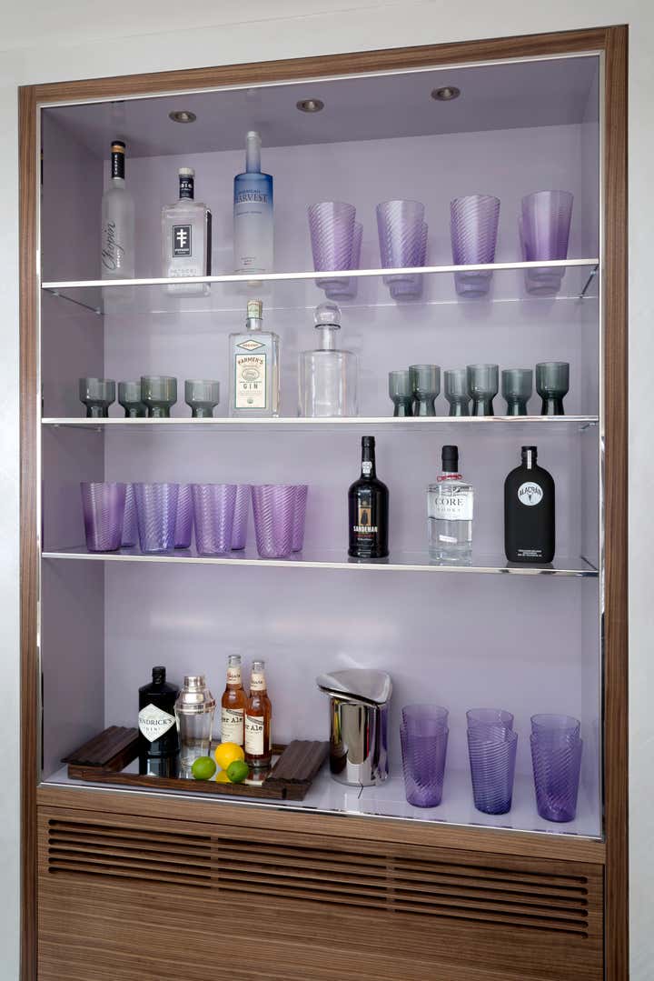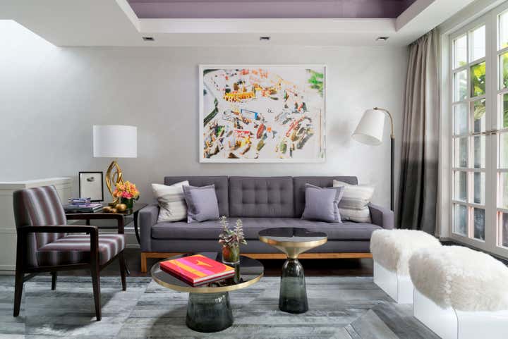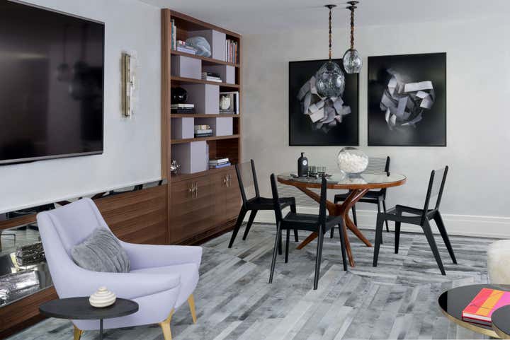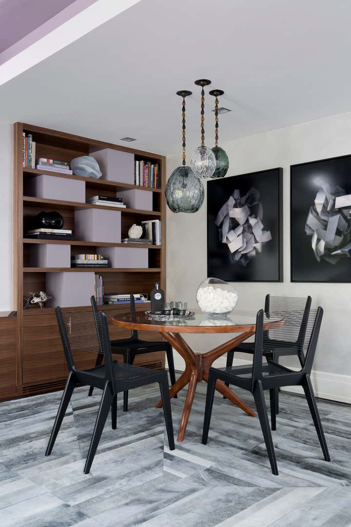 For the 2013 Kips Bay Designer Show House, we designed a family lounge that is casual yet sophisticated. From the vintage game table to the built-in bar in glass and lacquer, this space is meant to be used, not just admired. Up above, a lacquered ceiling glows, while the pony hair geometric rug feels luxurious underfoot. A soothing combination of greys and lavenders is echoed throughout the room.