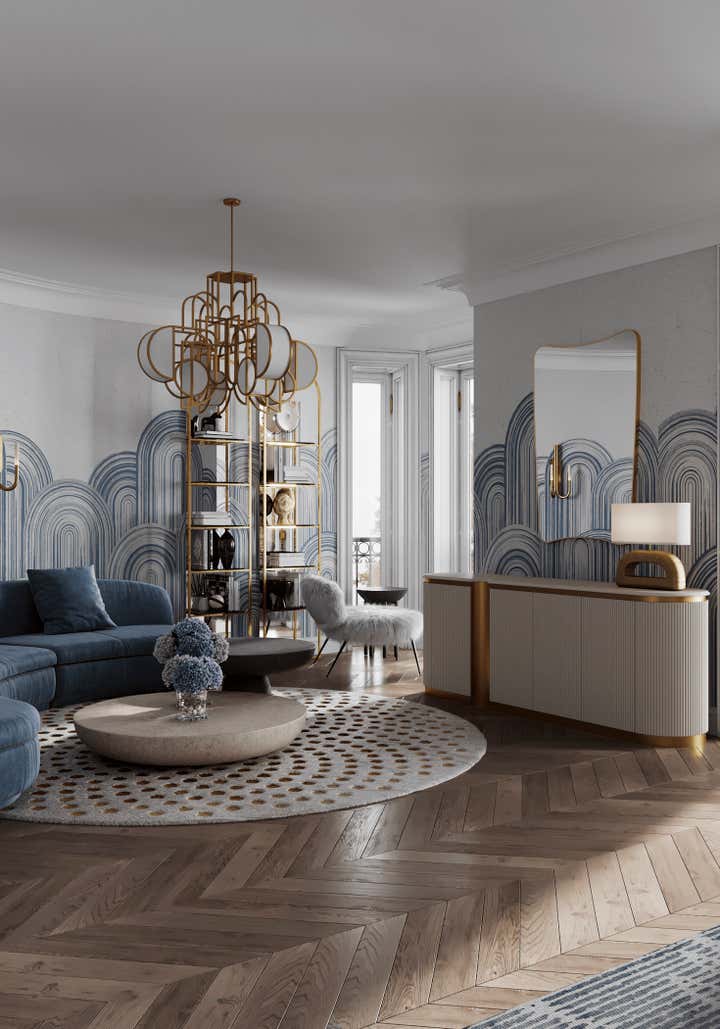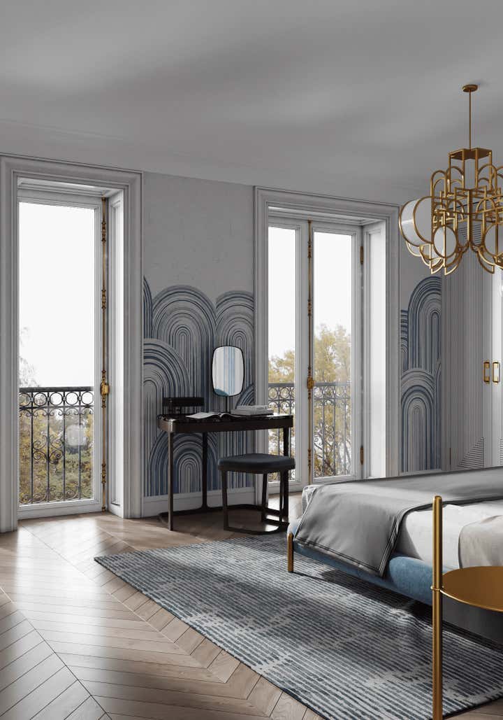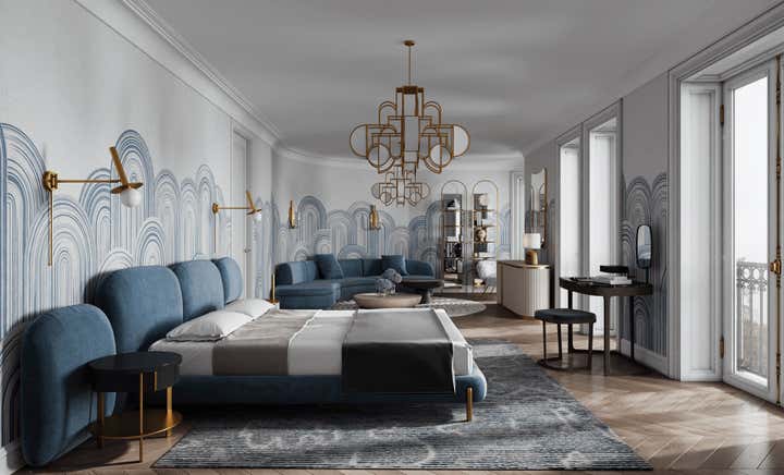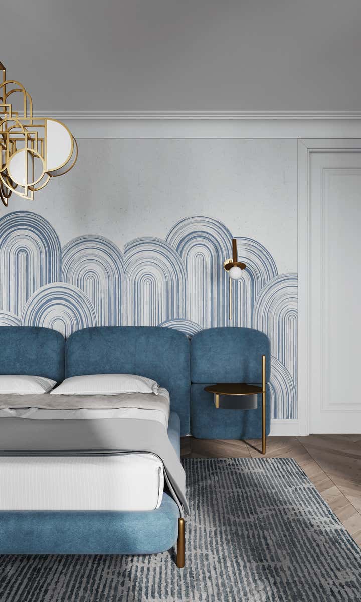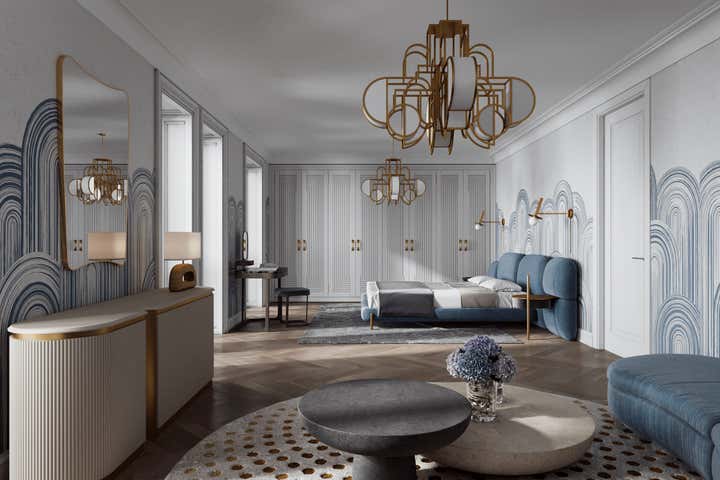 Classic and elegant interior design project within a historical Victorian building in Knightsbridge. Our team successfully transformed a traditional bedroom into a tranquil oasis for a young professional couple. The design blends a calming blue base with sophisticated gold accents, echoing the apartment s beautiful park views and sunrise-sunset glow. Drawing inspiration from the architectural arc elements within the building, we incorporated these soft, flowing lines in wallpaper, mirrors, and lamps, adding a touch of hazy elegance. Luxurious materials such as velvet, suede, and leather offer tactile richness and comfort, while a dedicated lounge zone creates an intimate space for relaxation. The result is a harmonious blend of classic and contemporary design, a serene sanctuary imbued with light and movement.