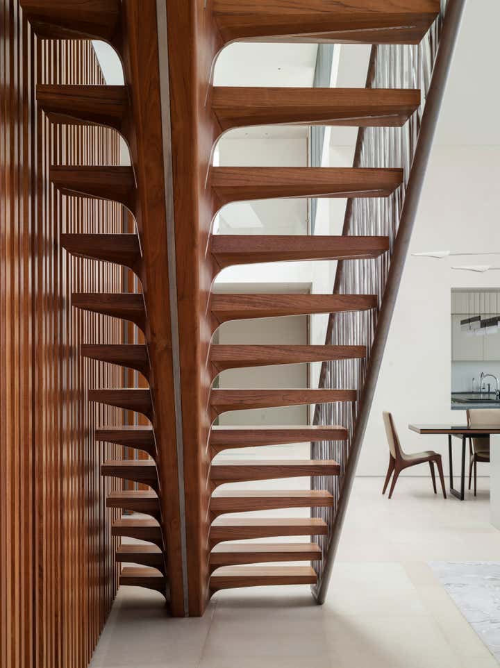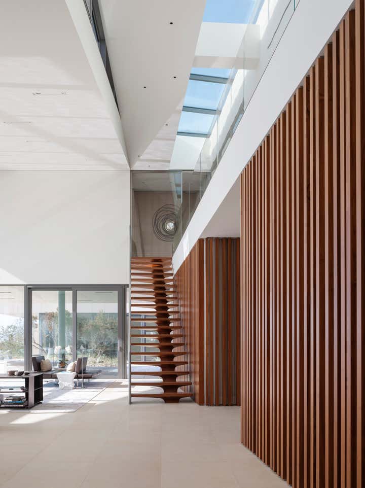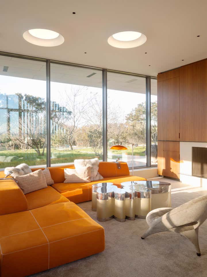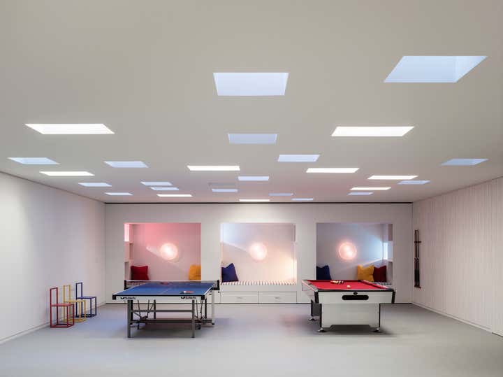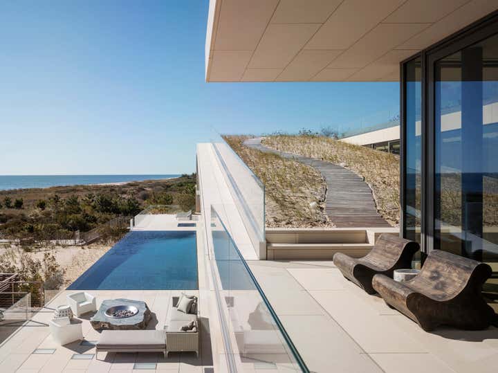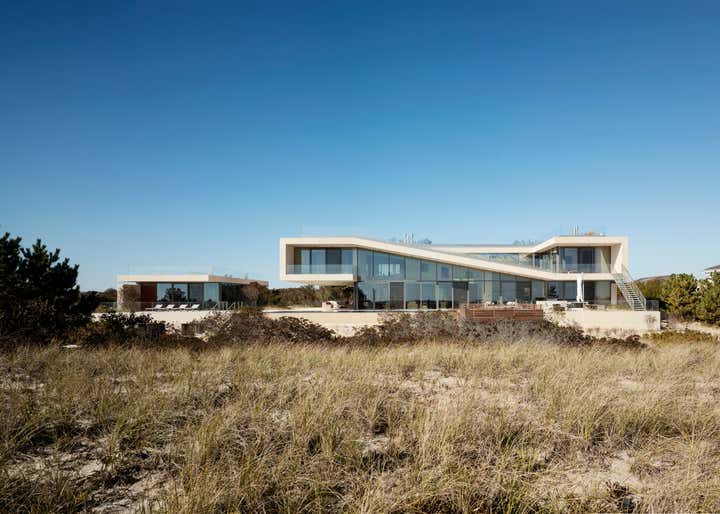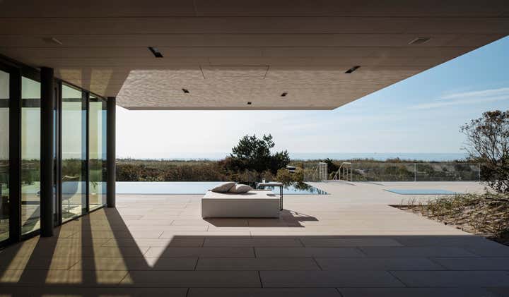 Designed in direct response to its coastal setting on Long Island’s eastern shore, this beach house is composed of two volumes—a main living area and a separate recreation pavilion—set on a base that extends into the dunes. The northern approach presents a solid, stone-clad façade with carefully placed openings, while the southern elevation opens fully to the ocean with floor-to-ceiling glazing. At the heart of the home, a double-height gathering space anchors the interior, with private family areas positioned along the edges for a balance of openness and retreat.