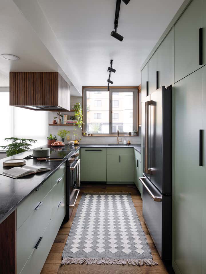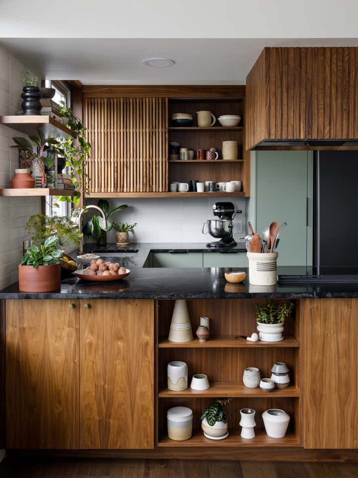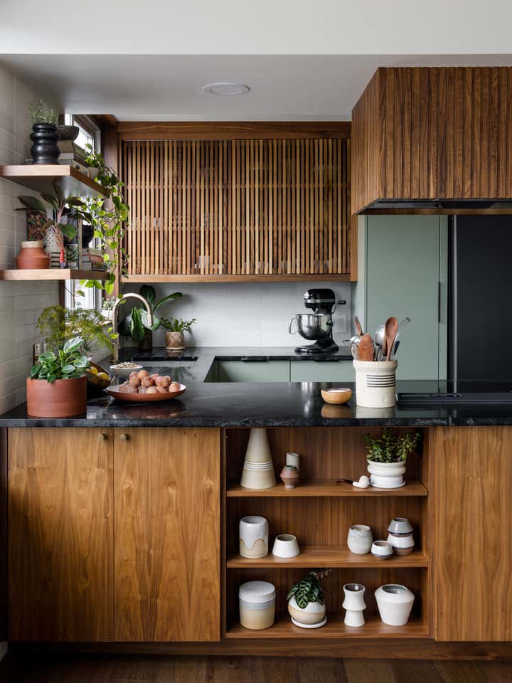 The two-bedroom condo was built in 1963 – just after the World’s Fair in Seattle and little had changed with this kitchen. True to kitchen design at that time, it was walled off with walnut panels and a sliding door. With homeowners who love to cook and entertain, the original kitchen needed a complete overhaul. Appliances didn’t work. Storage and counter space were lacking. The entire room was cramped and closed off from the condo (and the view). We wanted to pay homage to its MCM roots while adding in my client’s own eclectic flair. Walnut was paired with a sage green paint color, slatted wood and sliding doors to give us a nod to the past while squarely planting a foot in the future. We doubled the size of the kitchen in the process. In addition, an unused nook near the dining room was turned into a bar.