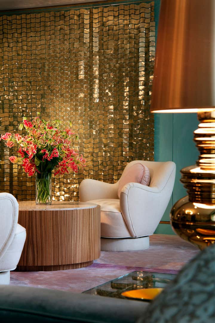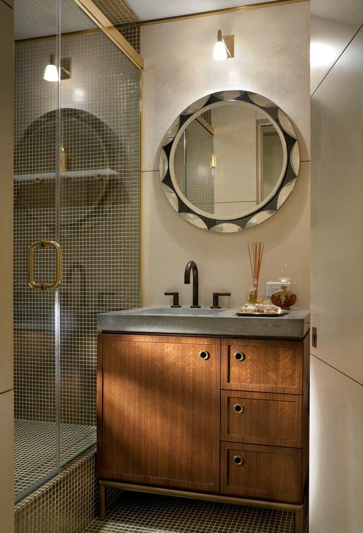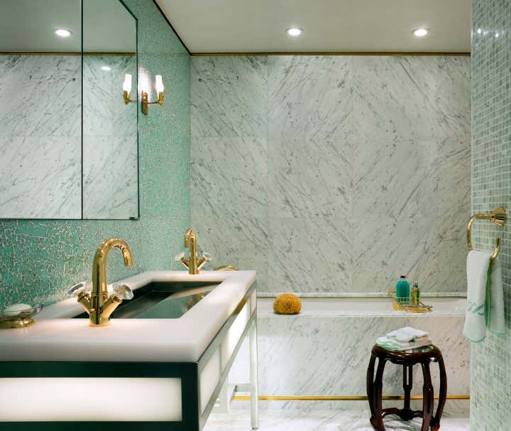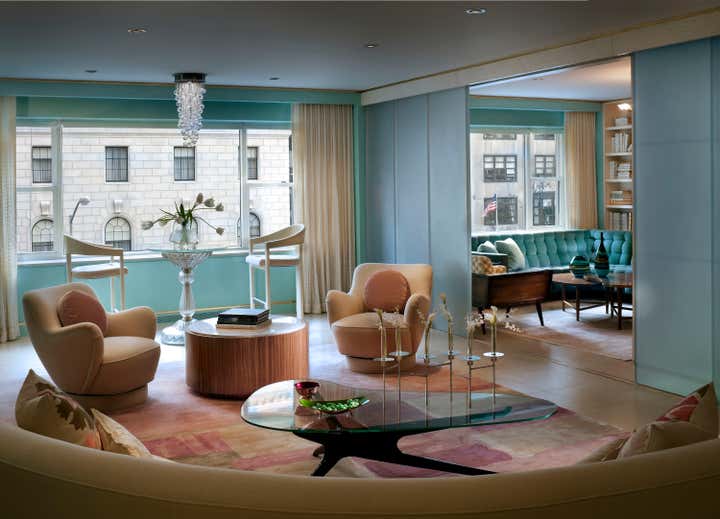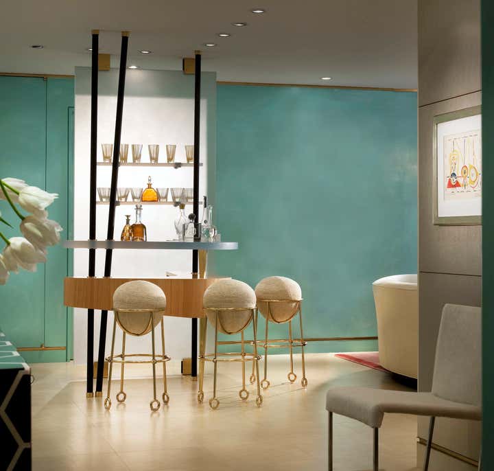 Governed by a green plaster finish that flows throughout the main, living and dining rooms, this East Side Apartment flirts with a multitude of styles from Mid-Century Modern to French Forties. Resin doors divide the two main living spaces, allowing for an open floor plan or privacy depending on the occasion.