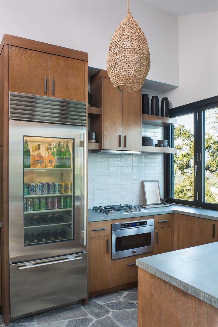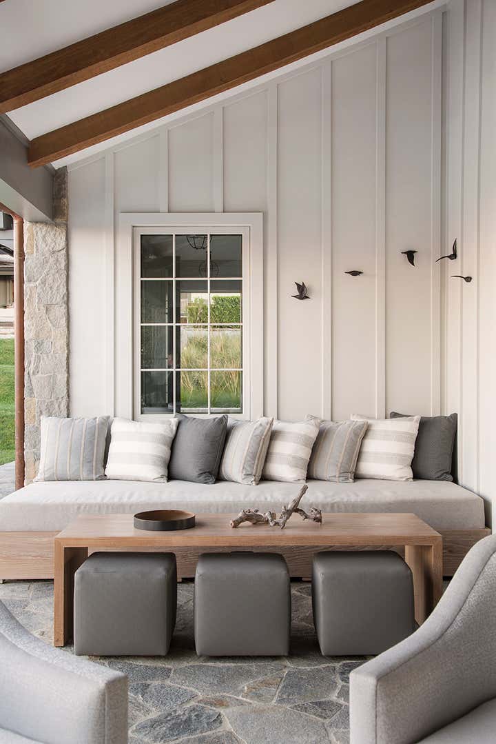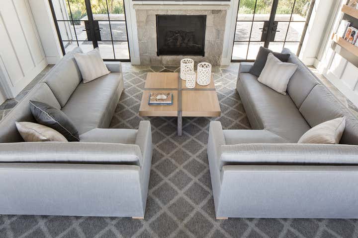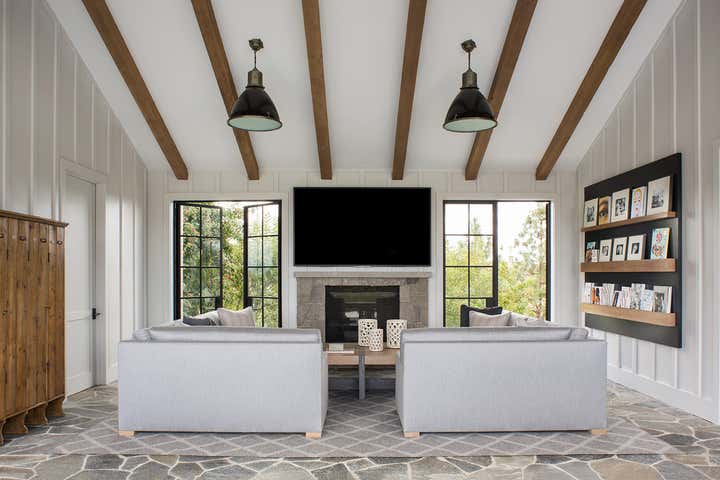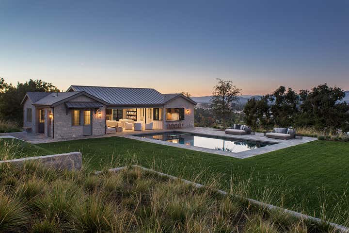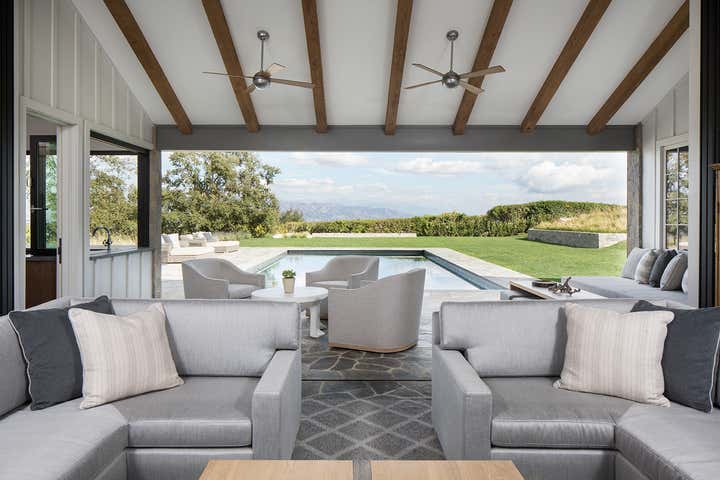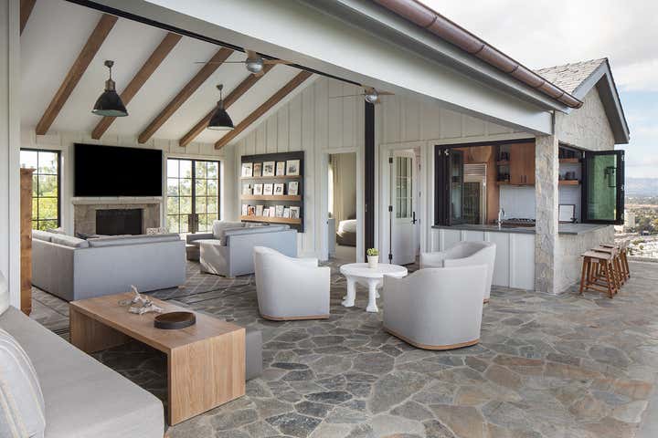 This pool house is newly constructed and was conceived as two stacked stone structures joined by a massive porch. The decision to enclose the porch with seamless slide away doors was made in order to offer the clients year round use. The pool house was designed to take full advantage of the properties incredible mountain views and to maximize indoor/ outdoor living so admired about Southern California. Comprised of a spacious living room, full kitchen, guest room with en-suite bath, a pilates studio and changing room complete with a luxurious steam shower. With the 13’ high doors opened, the living room and kitchen become part of the outdoors and the patio part of the pool house itself. This well-appointed escape from the main house features luxe fabrics, high-end materials, custom designed furniture pieces and impeccable finishes that can also withstand the elements. A serene color palette was used throughout to calm the eye. The furnishings were designed to insure aesthetic admiration, to offer ultimate comfort and to encourage relaxation. We have created an ideal, personalized retreat, a family gathering space and the perfect venue for entertaining, in or out of the pool.