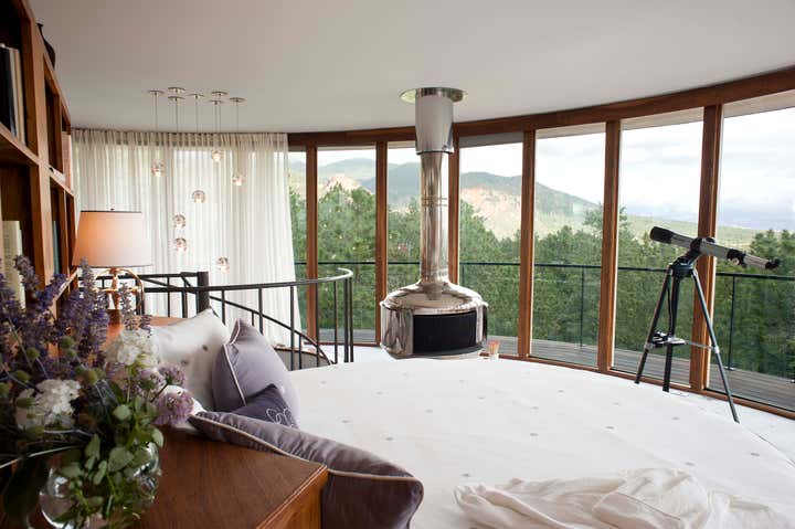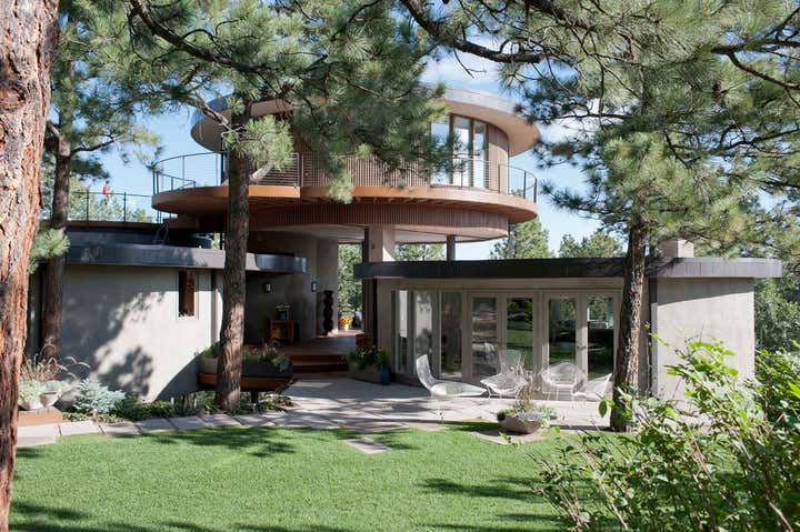 Perched on a steep wooded hillside above the historic Broadmoor hotel in Colorado Springs, the “Round House” reveals an exuberant architectural experiment with circles on a daring site. The house is primarily composed of three overlapping circles with three distinct structural systems floating over one another and connected by broad generous decks to capture amazing views. Local builder and developer Don Price (1914-1977) originally designed and built the experimental round house for himself and his family in 1968.