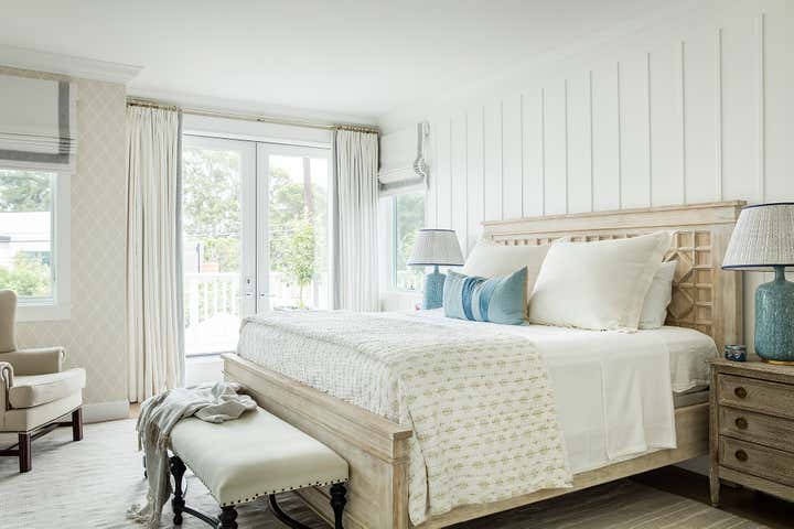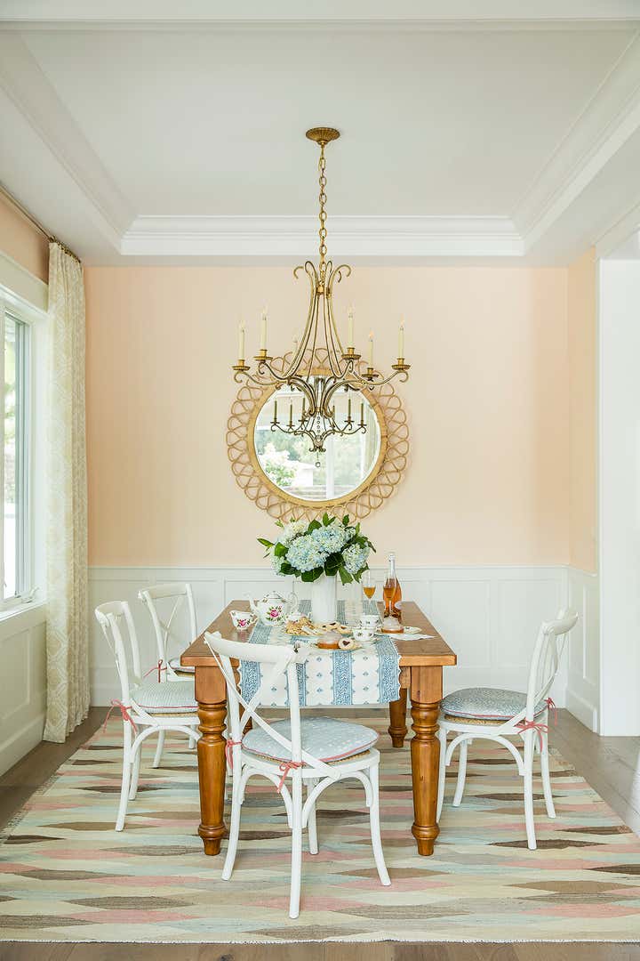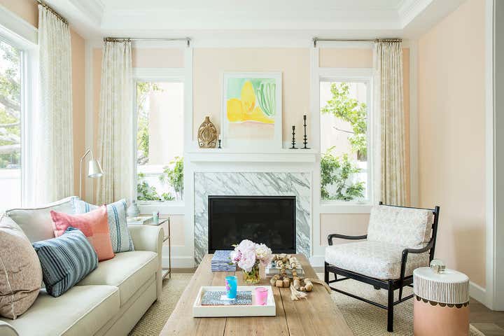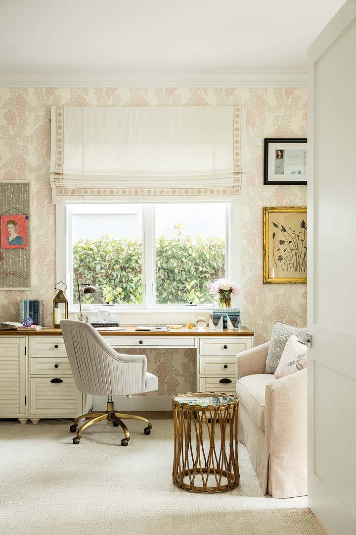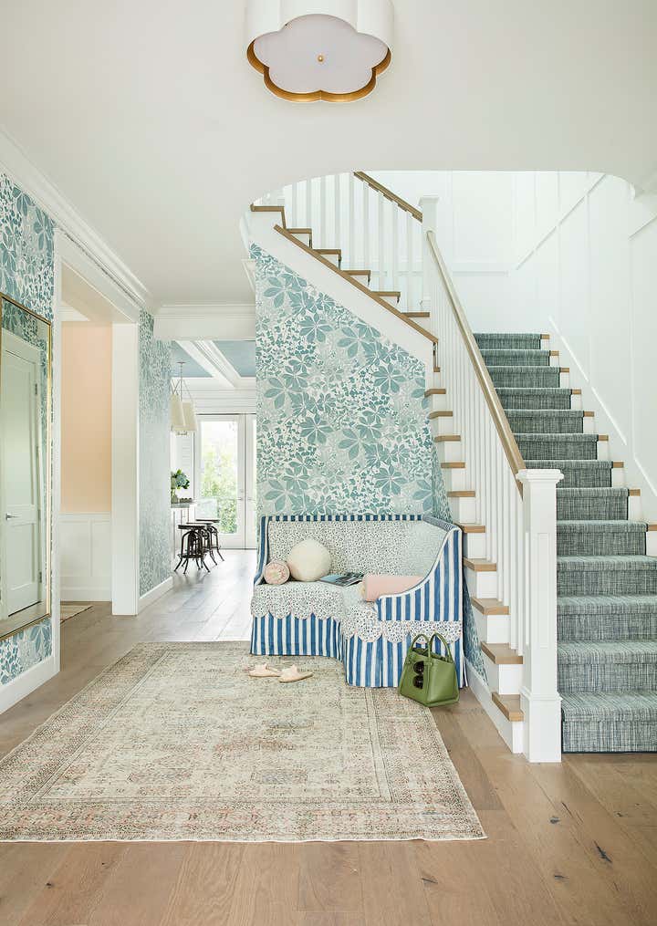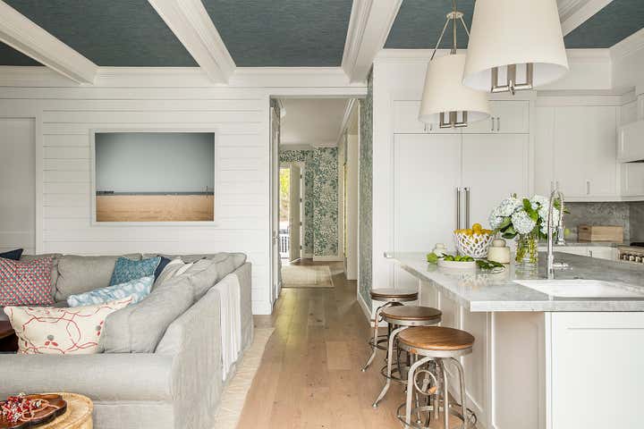 A traditional two-story farmhouse in the heart of Santa Monica is given a beachy and feminine refresh for the stylish young homeowner. A colorful array of fabrics and bold wallcoverings offset the white woodwork throughout the residence.