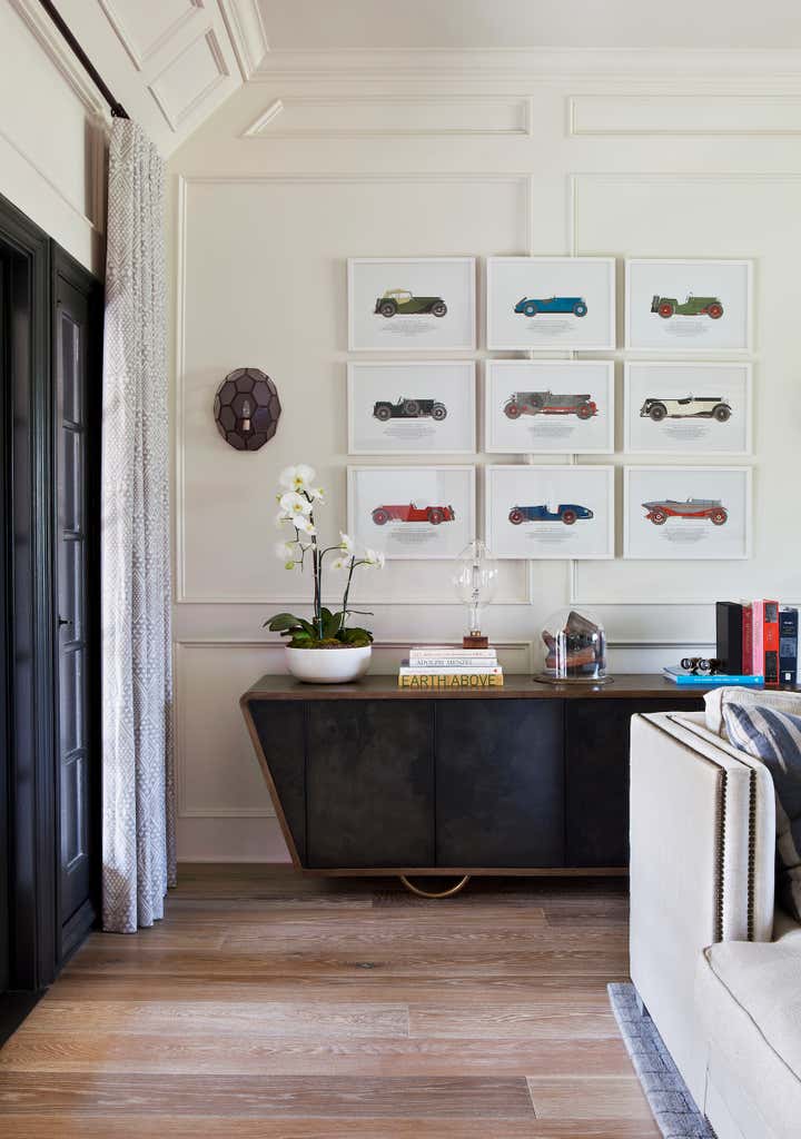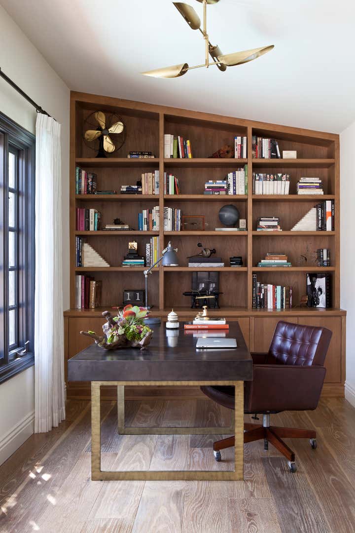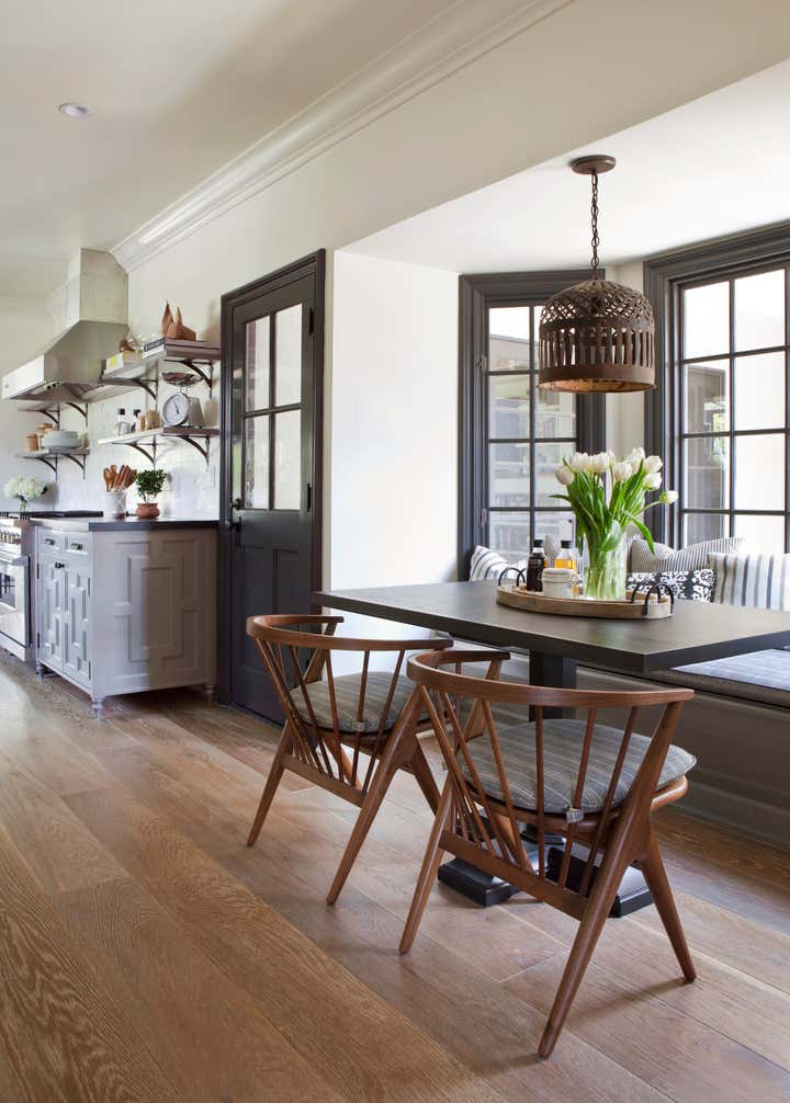 When the homeowners moved in, the kitchen was dark and separated from the dining room. They wanted an open and airy kitchen that would serve as a family gathering point. Ryan Brown and his team at Brown Design Group reconfigured the space so the family could have their cake and eat it too. Designing Craftsman-style cabinetry and a breakfast nook for casual meals and games, Brown took the word “open” literally and designed part of the kitchen with open shelving for added charm. The rest of the house is decorated with Ryan’s signature mix of contemporary and vintage, including the nickel dining table base and leather chairs and the Danish midcentury chairs in the breakfast area. All in all, the interiors looks as they have been collected over a long period of time.