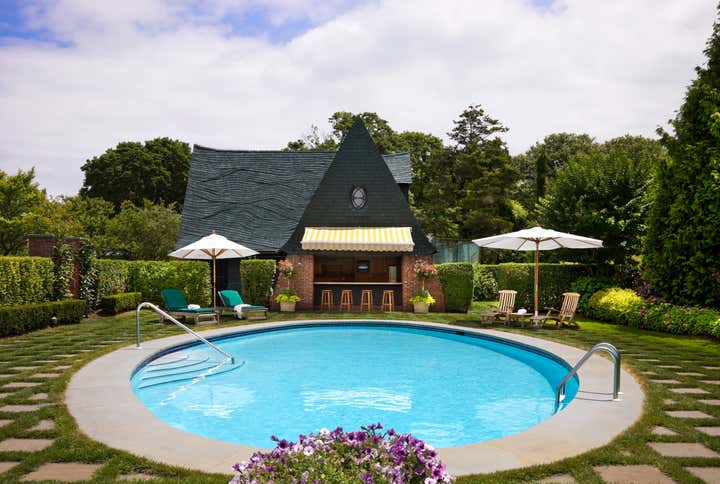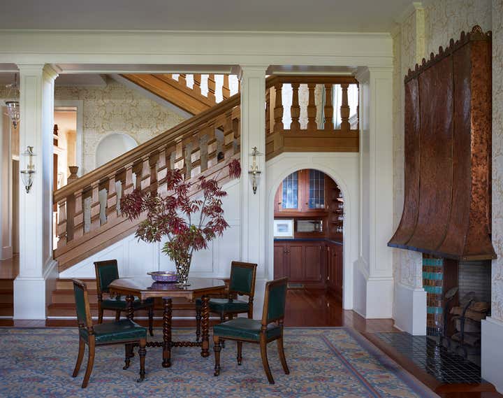 This New Jersey residence combines a steeply sloping Shingle Style roof with English Cottage Style brick buttresses, resulting in a "Shinglish" hybrid. Irregular clinker bricks animate the surfaces of strongly geometric forms.