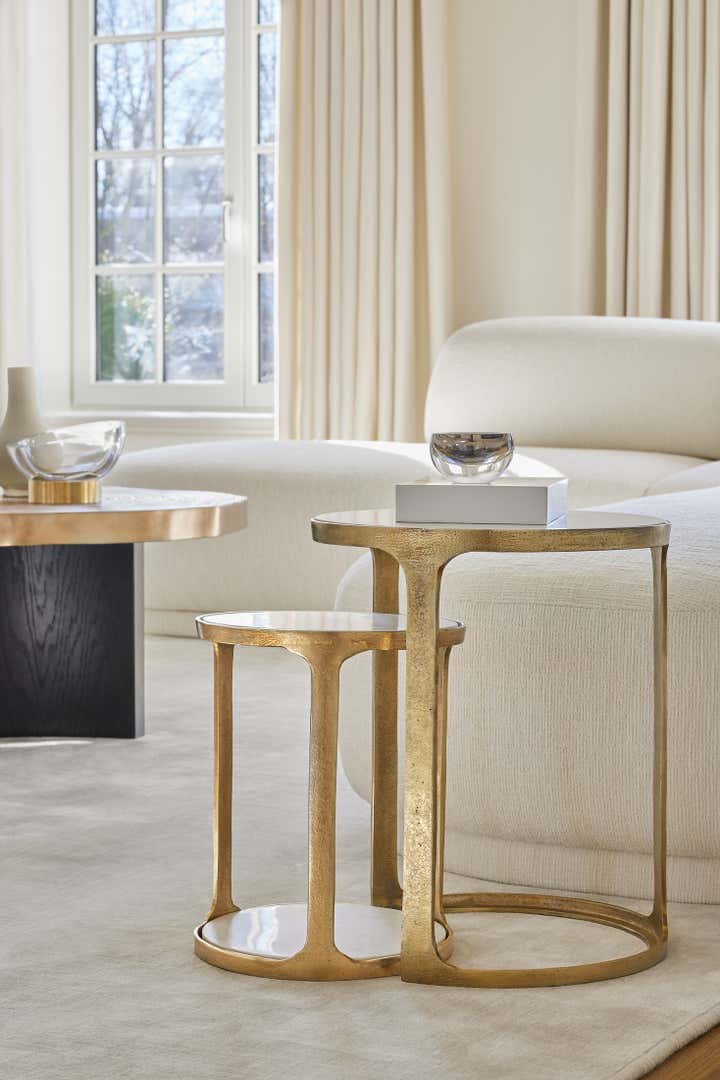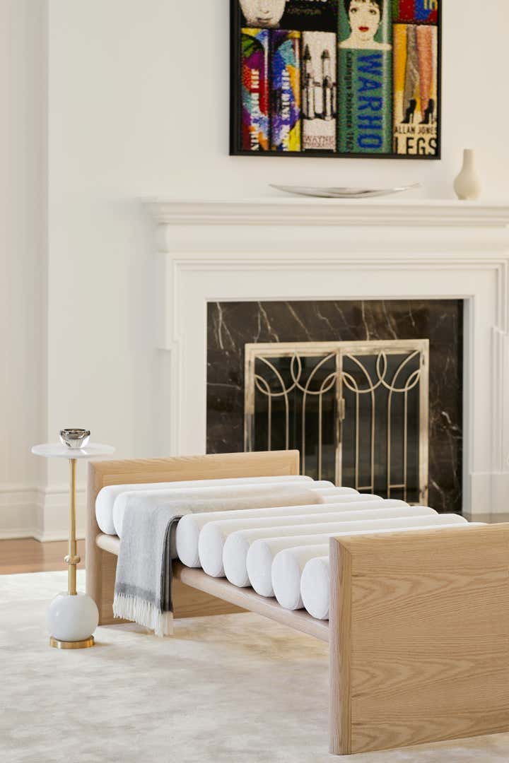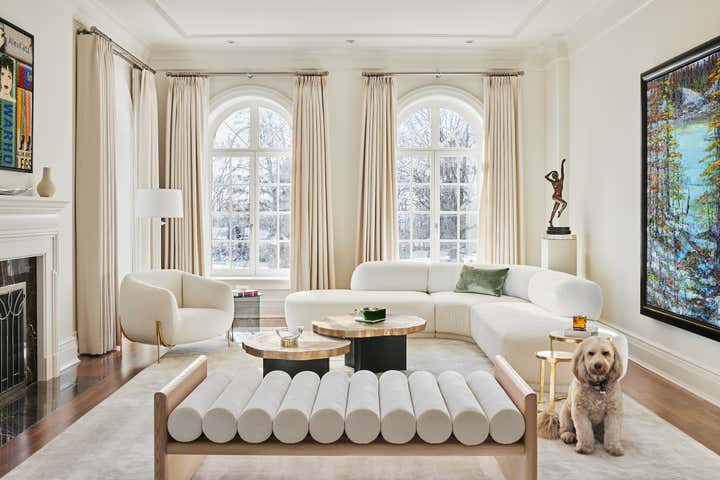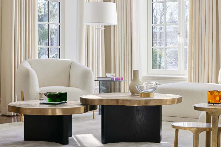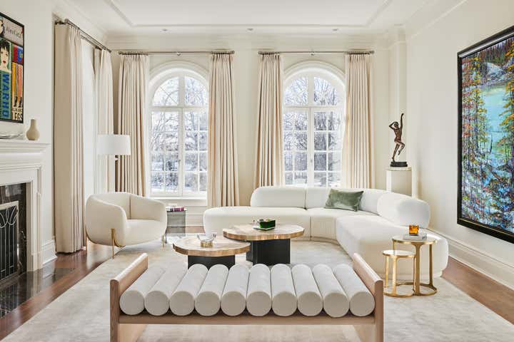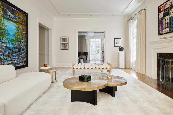 Mid-century modern furniture with organic forms, colorful artworks, soft textures and accents of gold and black animate the room.