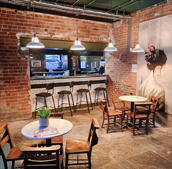 Furnishings were carefully chosen to reflect this dual narrative—ornate dark wood melding with sleek, brass-accented sophistication, capturing the essence of an old-world market with the polished air of a metropolitan eatery. Each piece, from the plush seating arrangements to the intricately detailed stools, was selected to harmonise historical elegance with the comfort and style of today s dining experiences.