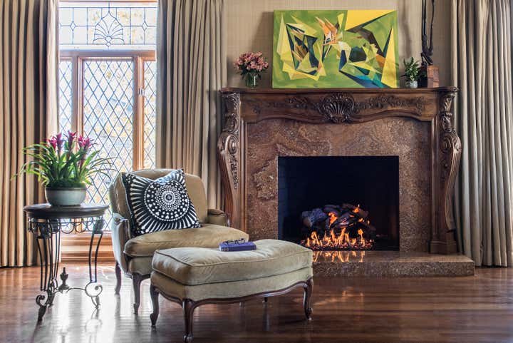 The traditional living room is at the heart of this restored Tudor revival estate. Restoring the home’s original details in combination with contemporary accents provides a warming update to this formal aesthetic — the restored original oak mantle pairs well with a new stone slip and hearth. Additionally, the home’s original leaded glass windows were preserved and the oak frames restored.