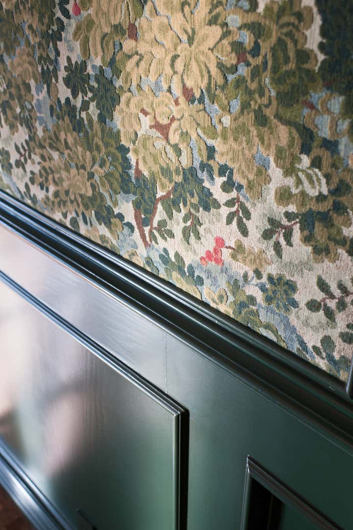 Luxurious tapestries in vibrant shades of forest green, chartreuse and burgundy adorn the walls of this Tudor revival dining room. Cotton velvet draperies in a saturated burgundy tone connect with the tiny berries in the woodland wall upholstery. The room s focal point, an antique dining table, is accompanied by six antique side chairs which were re-finished and re-upholstered.