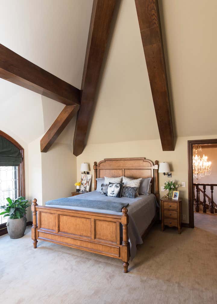For the primary bedroom suite, Sarah Barnard designed a California King sized bed and coordinating nightstands made of American Walnut with bronze hardware. Carved by master craftsmen in Los Angeles, the raised panels, fluted carvings, and intricate floral details define the one-of-a-kind Victorian-inspired bed explicitly created for this home.
