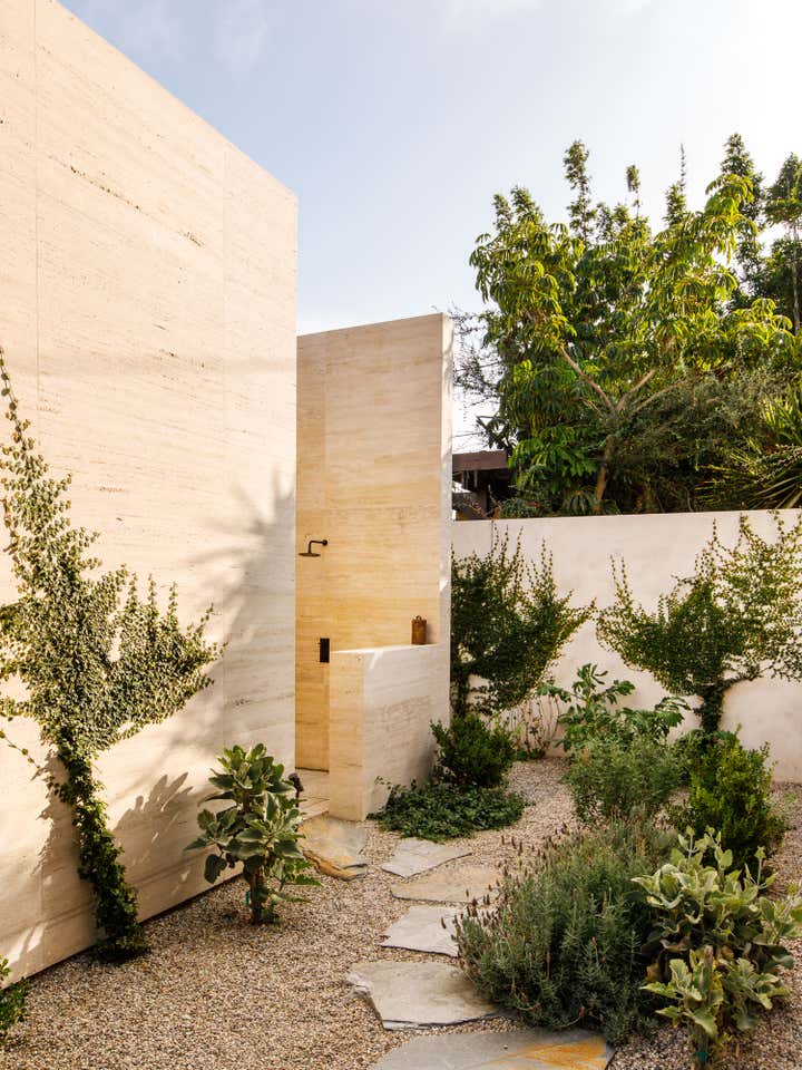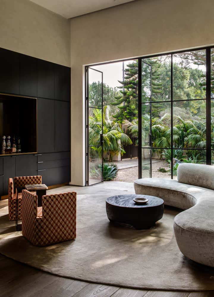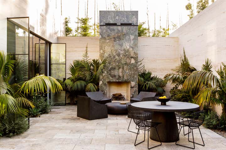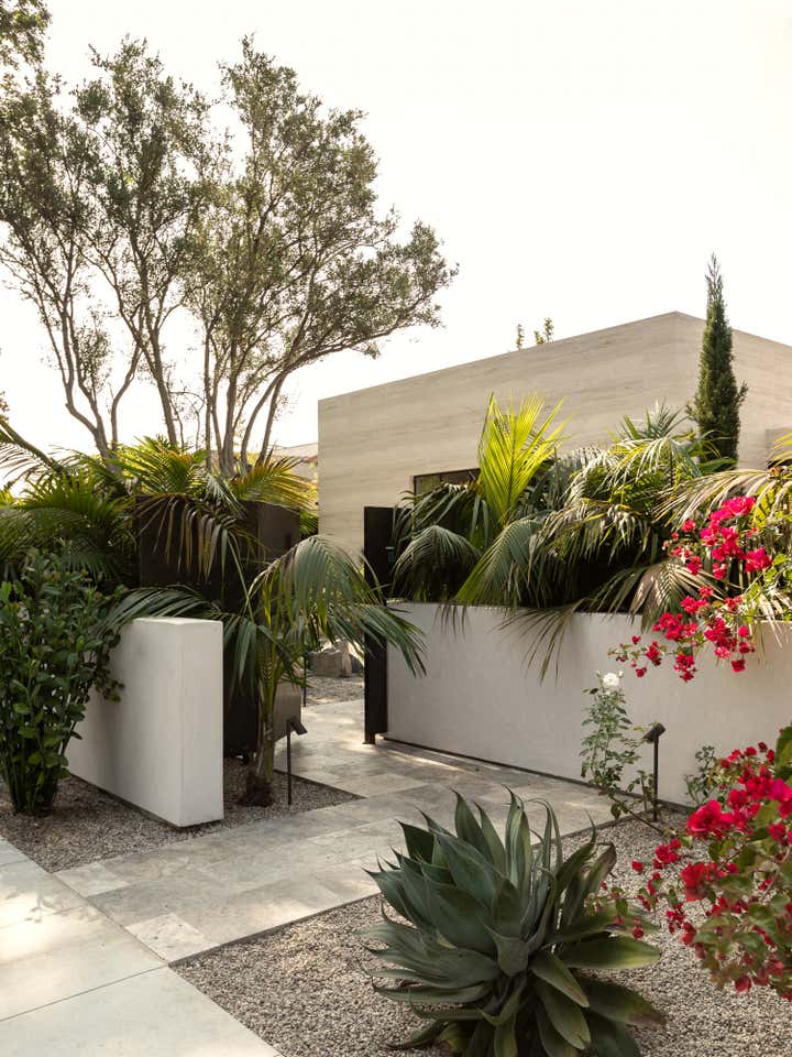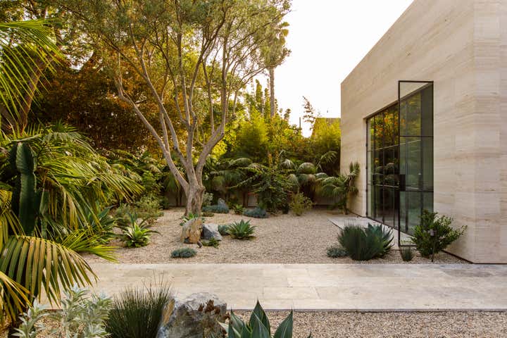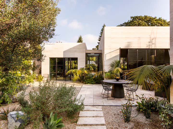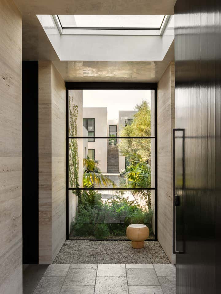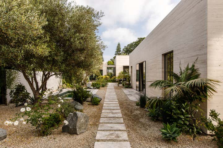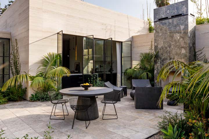 The home s layout drew from Hacienda-style architecture and modern family compound designs, connecting interior and exterior spaces with gardens and abundant light. The property features architectural cornerstones, limestone, and vein-cut travertine finishes, as well as custom steel windows framing picturesque views. Warm plaster finishes and vibrant touches of turquoise complement the verdant landscape by Terremoto, creating a lush retreat.